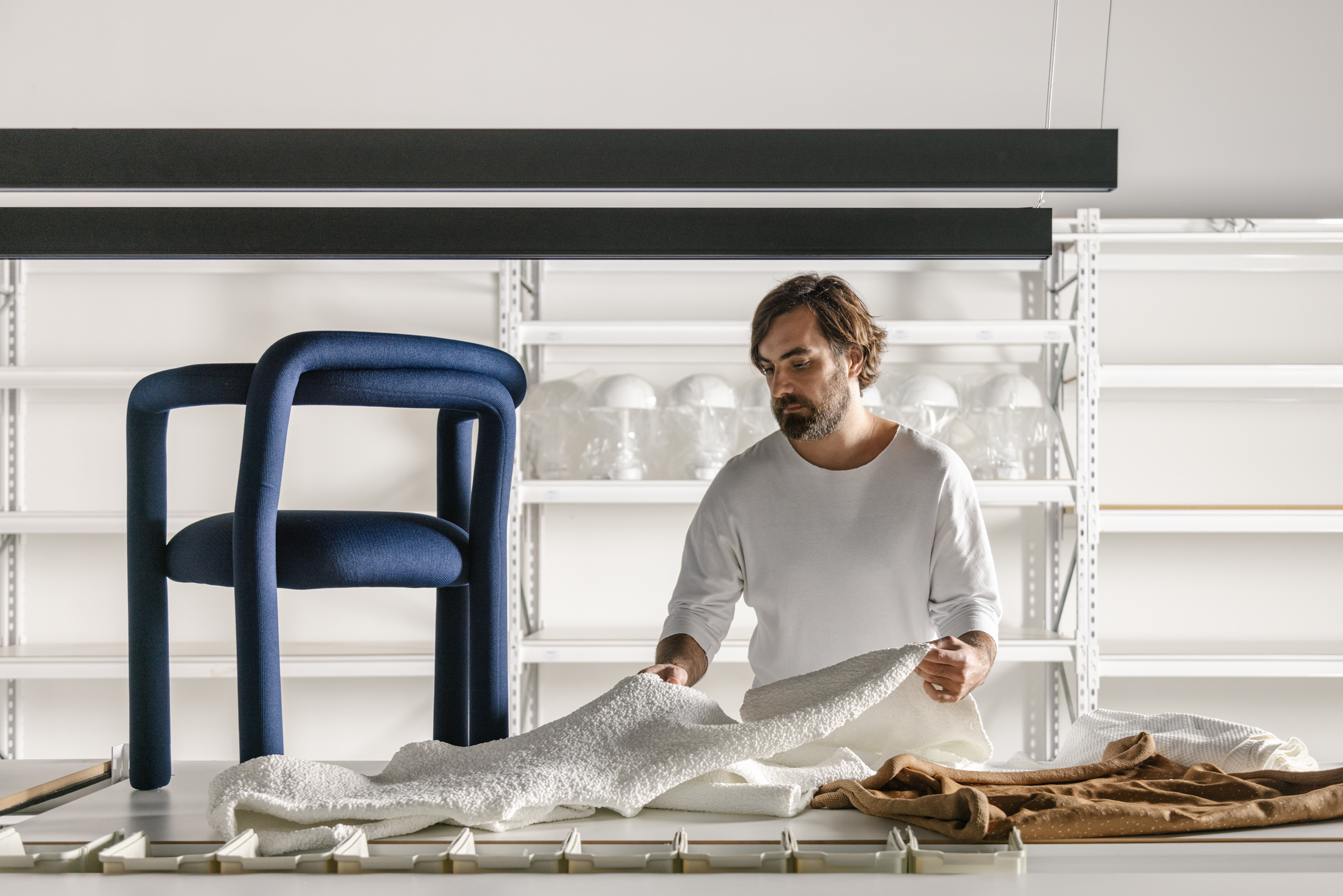 The alluring collection features a strong sense of materiality. In the upholstered pieces, technical research into fabric development has led to bespoke solutions tailored to the designs using their We-Knit textile. This particular fabric, woven from virgin polyester and recycled ocean plastic, is created using a computerized 3D-weaving technique. Developed by the clothing industry, it allows an entire slipcover to be created in one continuous piece, pre-shaped to match the product's form. The pieces are then hand-fitted and finished with thread made of recycled plastic. Wentz has trademarked this innovative process which yields seamless, surprising shapes.