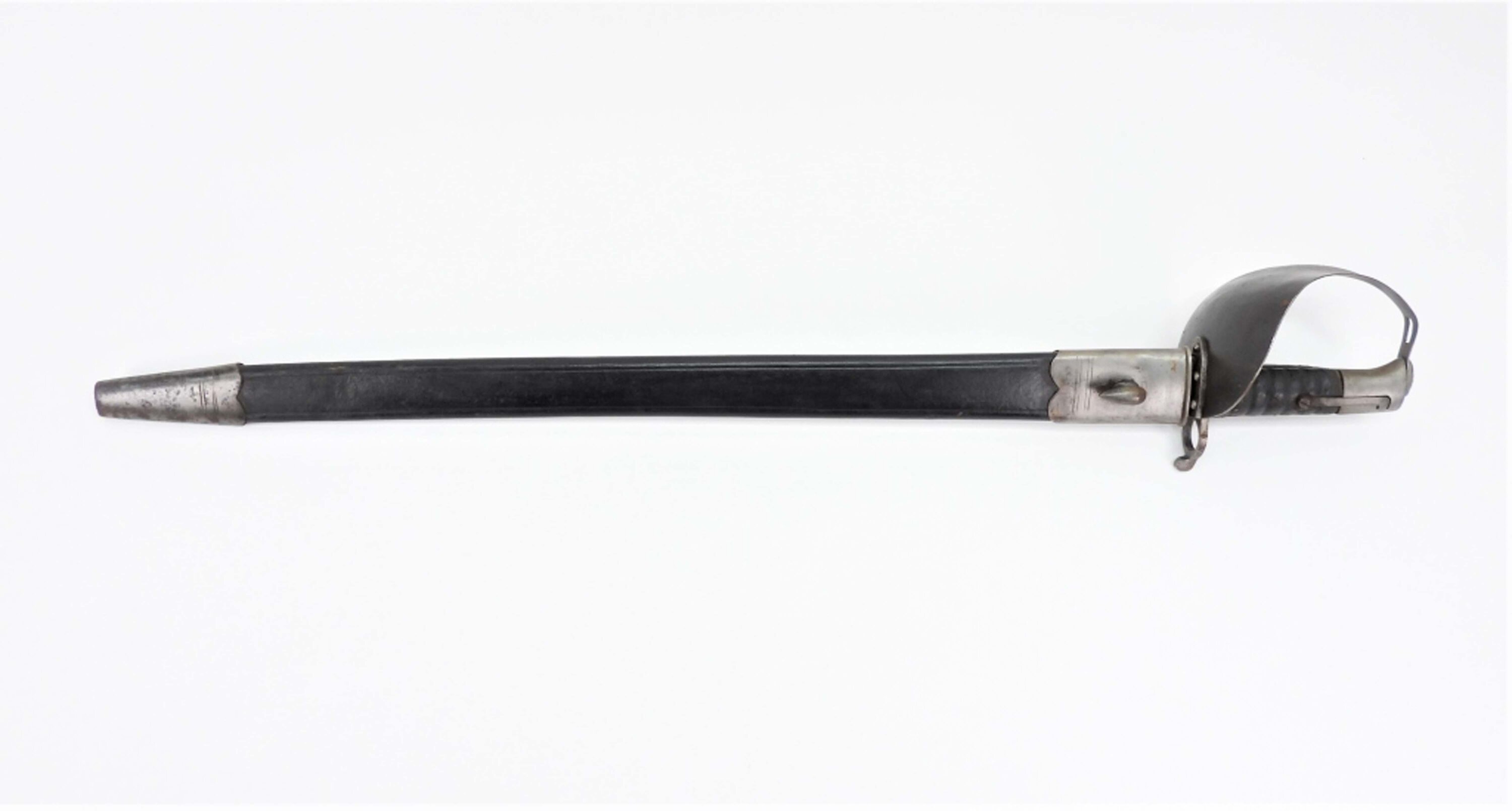 A British pattern 1859 Type 1 naval cutlass/bayonet with steel hilt and knuckle guard, overall 32 ¾ inches long with a 27 ¼ inch blade, having a leather-wrapped wooden grip, a steel blade with no visible markings and a black leather scabbard with steel throat and drag, in good condition, the steel showing light scatted patina, should make $300-$500.