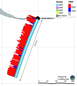 Drill hole HC22-RM015 was drilled to 175.5 meters (576 feet) and consisted primarily of CQM. As previously released, the last sample in drill hole HC22-RM015 contains a TREO value of 3,665 ppm. Since the previous release, the Company received all assays for drill hole HC22-RM015. This hole has an average TREO value of 4,303 ppm over an interval of 169.5 meters (487 feet).
