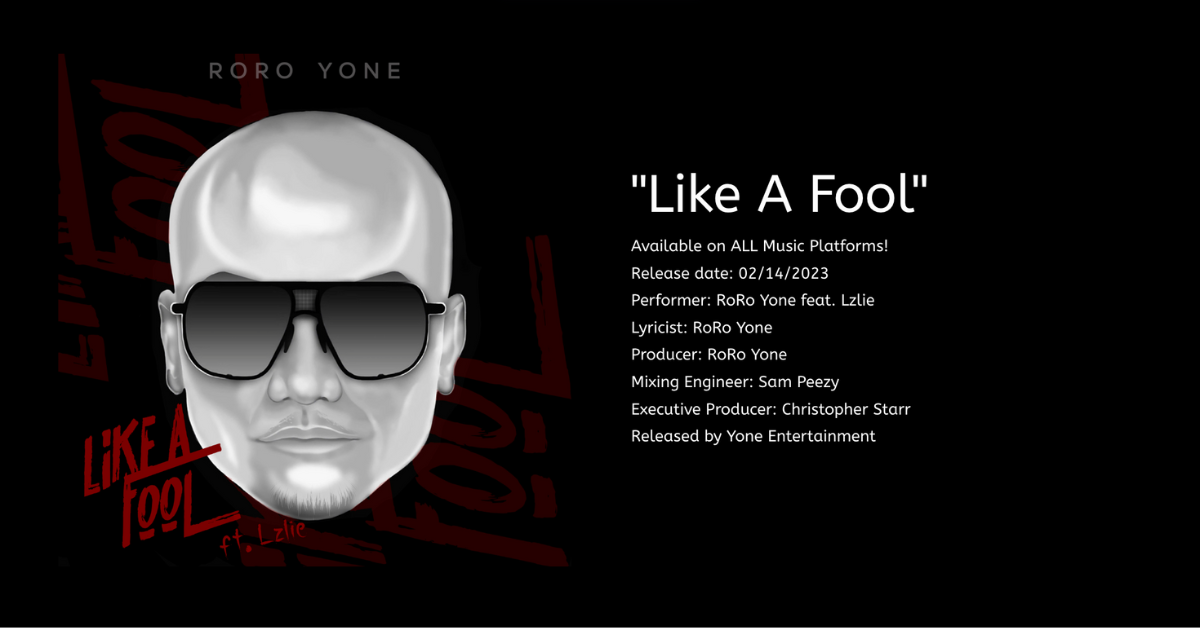 WASHINGTON, DC, USA, February 14, 2023 /EINPresswire.com/ -- The rising music sensation, Rodolfo Goyone Jr., known as RoRo Yone, is breaking the mold with his new single, "Like A Fool." This powerful track, released today on February 14, 2023, purposely on Valentine's Day, tackles the sensitive topic of relationship struggles and the importance of self-care. Valentine’s Day is normally all about the sweet side of love, the surprises, roses, dates, but RoRo Yone sees the other side that is rarely discussed on this special day."Like A Fool" is a catchy and relatable tune that speaks to those who feel like they're putting in all the effort in a relationship while their significant other is not. Yet blindness by feeling tends to win. RoRo Yone's sharp flow and clever lyrics drive the message home, reminding listeners that they deserve to be treated with respect and love. The song is written in the style of giving advice from friend to friend. Consistent with the rest of his music, RoRo Yone writes about his observations of others, rather than about his own life.