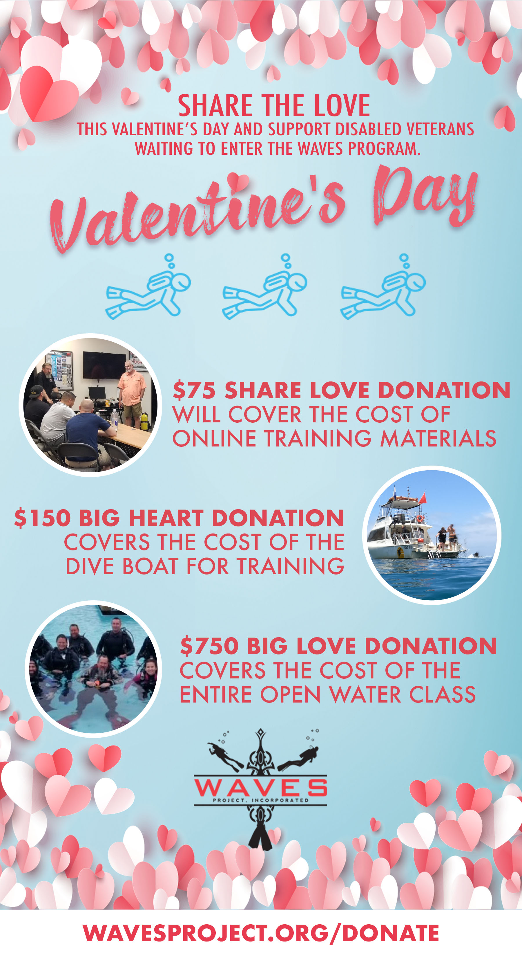 The WAVES Project is a 501(c)(3) nonprofit organization providing wounded American veterans with service-connected injuries the opportunity to experience the freedom and therapeutic benefits of SCUBA diving. WAVES (Wounded American Veterans Experience SCUBA) Project looks to reduce the number of veteran suicides per day by helping wounded veterans discover our underwater world, recover through adventure, and rebuild relationships with family and friends. The organization serves any wounded warrior from brain trauma and triple amputees to those struggling with Post-Traumatic Stress. Programs provide training, equipment, service opportunities, and camaraderie giving veterans a sense of purpose through diving. Veterans build confidence as they complete tasks and accomplish goals, motivating them to move beyond their disability, helping them reintegrate back into society, and becoming engaged, productive members of their families and the community.