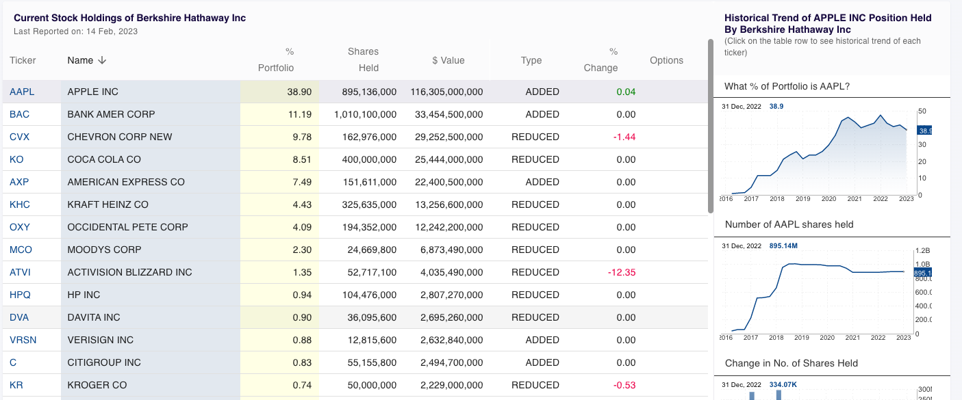 Berkshire Hathaway reported Q4 2022 holdings report. As is usually the case, there was no change to Berkshire's top holdings. Apple (AAPL) remains the top stock, standing at 38.9% of the portfolio. Bank of America (BAC) at ~11%, Chevron (CVX) at ~10%, Coca-Cola (KO) at 8.5% and American Express (AXP) at 7.5% of the portfolio remain the top 5 positions.