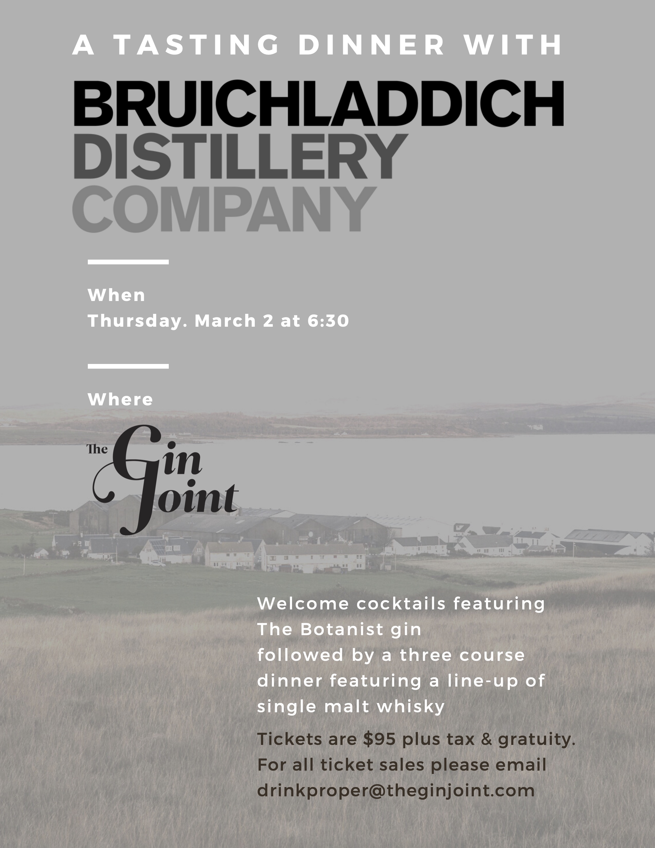 CHARLESTON, SOUTH CAROLINA, UNITED STATES, February 17, 2023 /EINPresswire.com/ -- It’s no secret that collaborations with brilliant minds in the food and beverage industry have incredible results, which is why Charleston’s The Gin Joint is partnering with Bruichladdich Distillery on Thursday, March 2nd at 6:30 pm to host a three-course tasting dinner. This limited, reservation-only, dinner will feature a welcome cocktail with Botanist Gin, followed by three courses paired perfectly with a range of single malt scotch whiskys distilled by Bruichladdich. Guests will also have the opportunity to purchase a supplemental, rare release from the distillery.The Tasting Dinner with Bruichladdich Distillery Company will take place at The Gin Joint at 182 East Bay Street and will cost $95 a head plus tax and gratuity. Please email drinkproper@theginjoint.com to reserve your spot and purchase tickets.