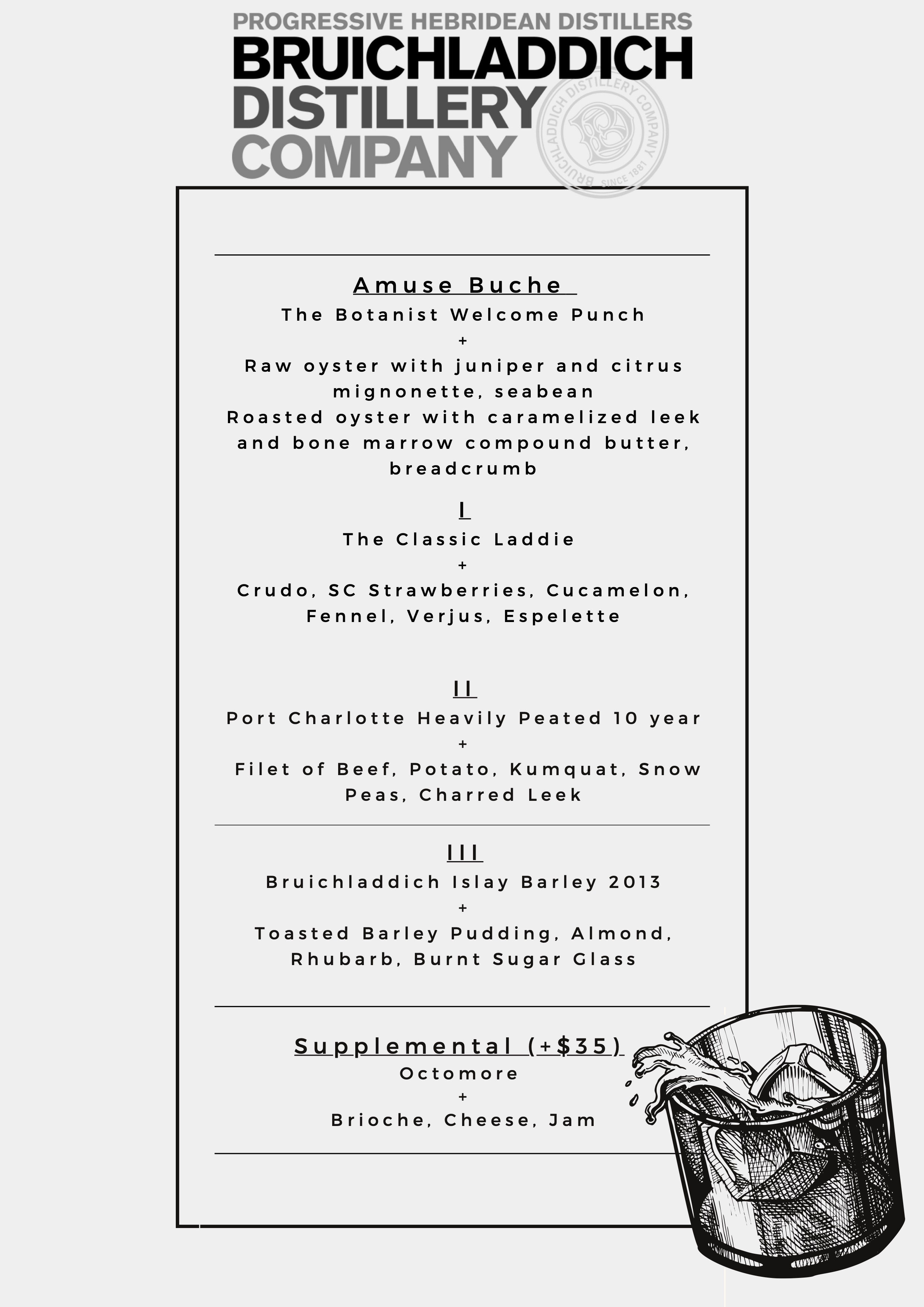 The Tasting Dinner with Bruichladdich Distillery Company will boast a menu consisting of :