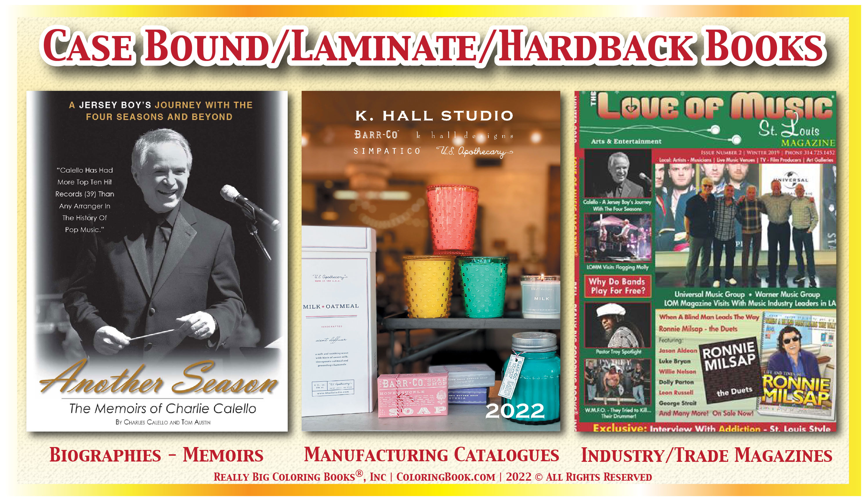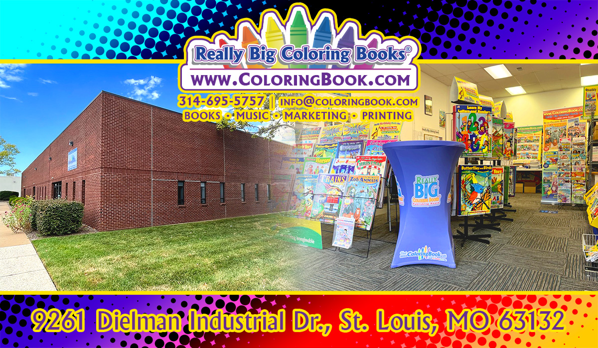 Really Big Coloring Books®, Inc., headquartered in St. Louis, MO, is a multi-national company providing quality adult and children’s teaching and learning tools, coloring book products for nearly three decades and publishes music. Known for their market leading position, the RBCB family of products are classic, colorful, unique and musical. The company owns more than 1600 coloring book and music related domain names in different countries. A trend-setting leader in children's publishing and the coloring book industry. The company holds membership in professional and trade organizations including The Missouri Press Association, System for Award Management for the U.S. Govt. (SAM), SAGE, ASI, and PPAI among others."