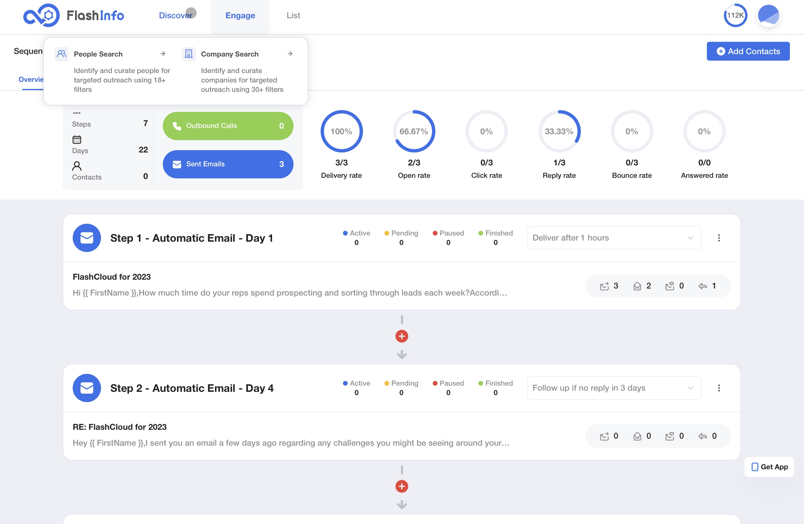 Additionally, the AI sequencer uses FlashInfo’s human data verification and email warmup to optimize messaging for deliverability, ensuring that sales messaging reaches its intended audience with a minimal bounce rate and maximum possible impact.
