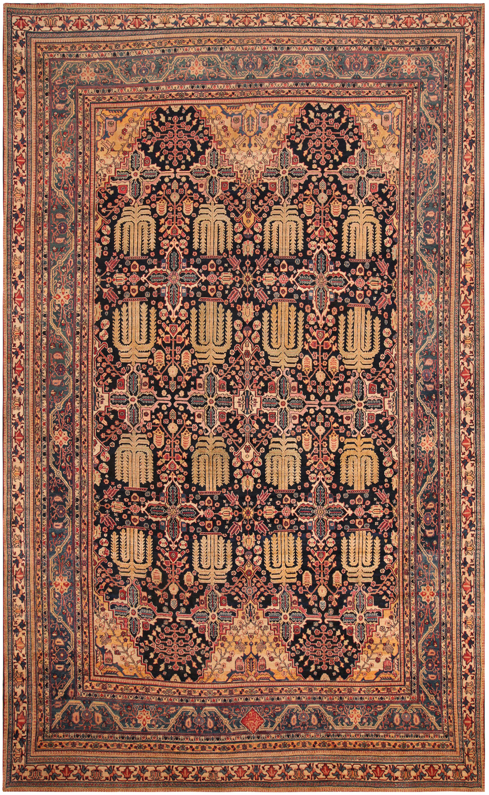 Another notable Persian rug available in this auction is a large antique Khorassan piece that measures nearly 20 feet by 12 feet (lot #8084; estimate: $20,000 – $30,000). It dates back to circa 1900. The Khorassan region encompasses many different rugmaking hubs, including Mashad and Doroksh. It boasts a long history of quality luxury weaving. The offered Khorassan carpet features a busy allover pattern anchored by symmetry and differently-sized design elements. A line of white-edged cross shapes anchor the middle of the rug, while wheat-shaped fronds, tiny flowers, and branching patterns cascade toward each end. This rug uses shades of red, yellow, and navy blue against a dark background, to great effect.
