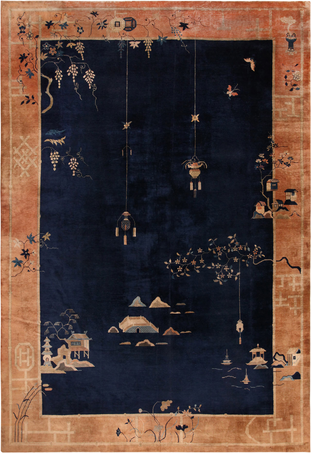 Chinese rugs and carpets are particularly highlighted in this sale, including a large antique Chinese Art Deco rug from circa 1920 (lot #8037; estimate: $6,000 – $9,000). Like many rugs from the Art Deco era, this example embraces asymmetry, dark colors, and a simple design. However, it still responds to many traditional motifs in Chinese rugmaking. Branching cherry trees, hanging lanterns, elevated riverside houses, and a subtle geometric border set this carpet apart.