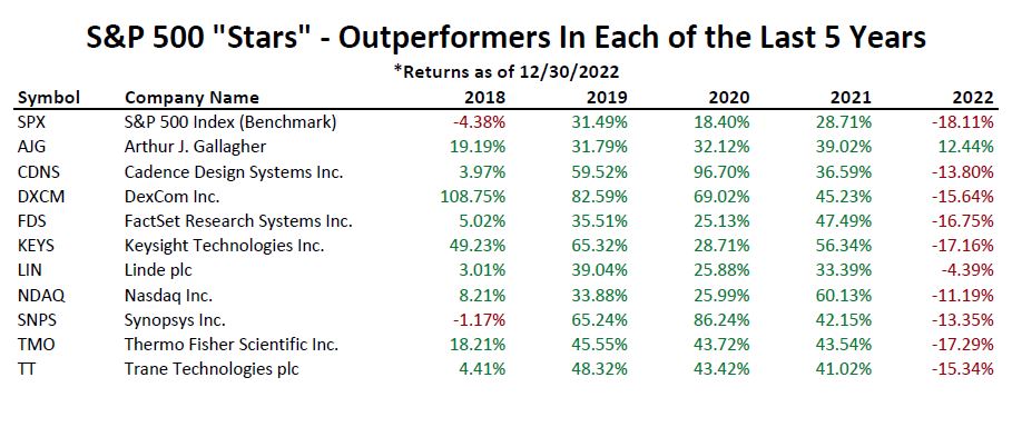 Only 10 Stocks Have Outperformed the S&P 500 in each of the Past 5 Years