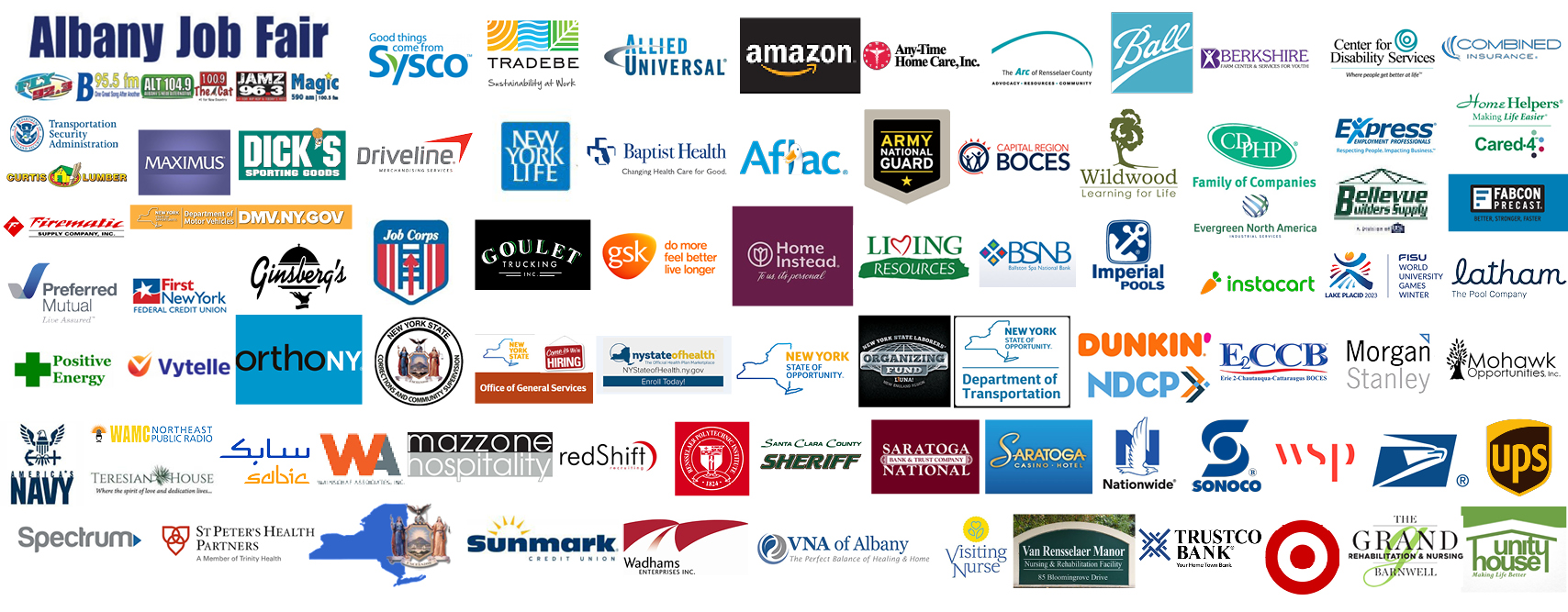Recruiters confirmed and on site include: SABIC, MAXIMUS, NYS Troopers, Dept. of Corrections, NY Army National Guard, Janitronics, Plug Power, Conifer Park, Combined Insurance - a Chubb company, Greater Johnstown SD, Visiting Nurses of Albany/Visiting Nurses Home Care, Express Employment Professionals, AMAZON, Teresian House, Frito Lay - Upstate NY East, Rensselaer Polytechnic Institute, Prime Management, Glenmont Job Corps, Sunmark Credit Union, Trustco Bank, Imperial Pools, Inc., Nationwide Retirement Solutions, OrthoNY, Law Firm of Alex Dell, PLLC, IRD (International Road Dynamics), Owens Corning, RedShift, Living Resources, CDPHP, Green Meadows, Carver Companies, The Grand at Barnwell, North Atlantic States Carpenters Labor Management Program, Price Chopper, Solomon Organization, Curtis Lumber, Fabcon Precast LLC, A New England Nanny, Bimbo Bakeries USA, Warren, Washington & Albany ARC, Ocean State Job Lot, Albany Broadcasting, SYSCO, Van Rensselaer Manor, H&R Block, First Student, BOCES Albany-Schoharie-Schenectady, Vanderheyden Hall, AFLAC, Sam's Club, Local 669 America's Fire Protection Union, St Peter's Health Partners, DeCrescente Distributors, Home Instead, Saratoga Casino Hotel, NY Creates, Latham, The Pool Company, Firestone Complete Auto Care, Pregis, FASNY Fireman's Home, Robert Half, College of St Rose, Unity House of Troy, INC., Yankee Trails, Callanan Industries, NYS Office of General Services, NY Life, Ferguson Enterprises, Albany Medical Center, Air National Guard, Centrotherm, Nathan Littauer Hospital, BSNB, Ravena Coeymans Selkirk CSD, NY State of Health, Primark, New York State Office for People with Developmental Disabilities, Fusco Personnel, Grasshopper Heating and Cooling, Spectrum (Time Warner Cable Recruiting), VP Supply Corp, Traveler's Insurance, Midland Farms, United Mobility and Accessibility Inc., Saratoga National Bank and Trust Company, Spectrum - Sales & Marketing, Prime Storage Group, Albany City School District, Berkshire Health Systems, Ace Hardware, AIM Services, Inc., Spectrum, Wadhams Enterprises, Inc. , Trucking Association of New York, NYS Dept of Labor, ARC of Rensselaer County, USPS, Department of Civil Service and Lake Placid 2023 FISU World University Games.