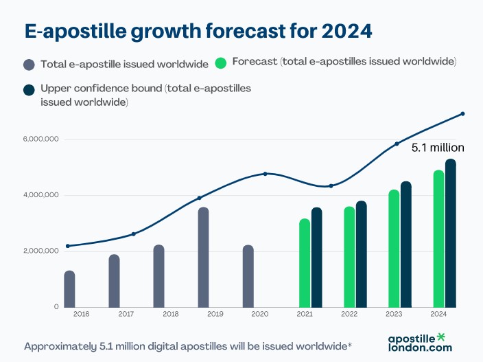 A recent study conducted by London Apostille Services Ltd. on the Summary of Responses to the Apostille Questionnaire 2021 presented by the HCCH found that e-Apostille use will grow by 24.39% to 5.1 million.