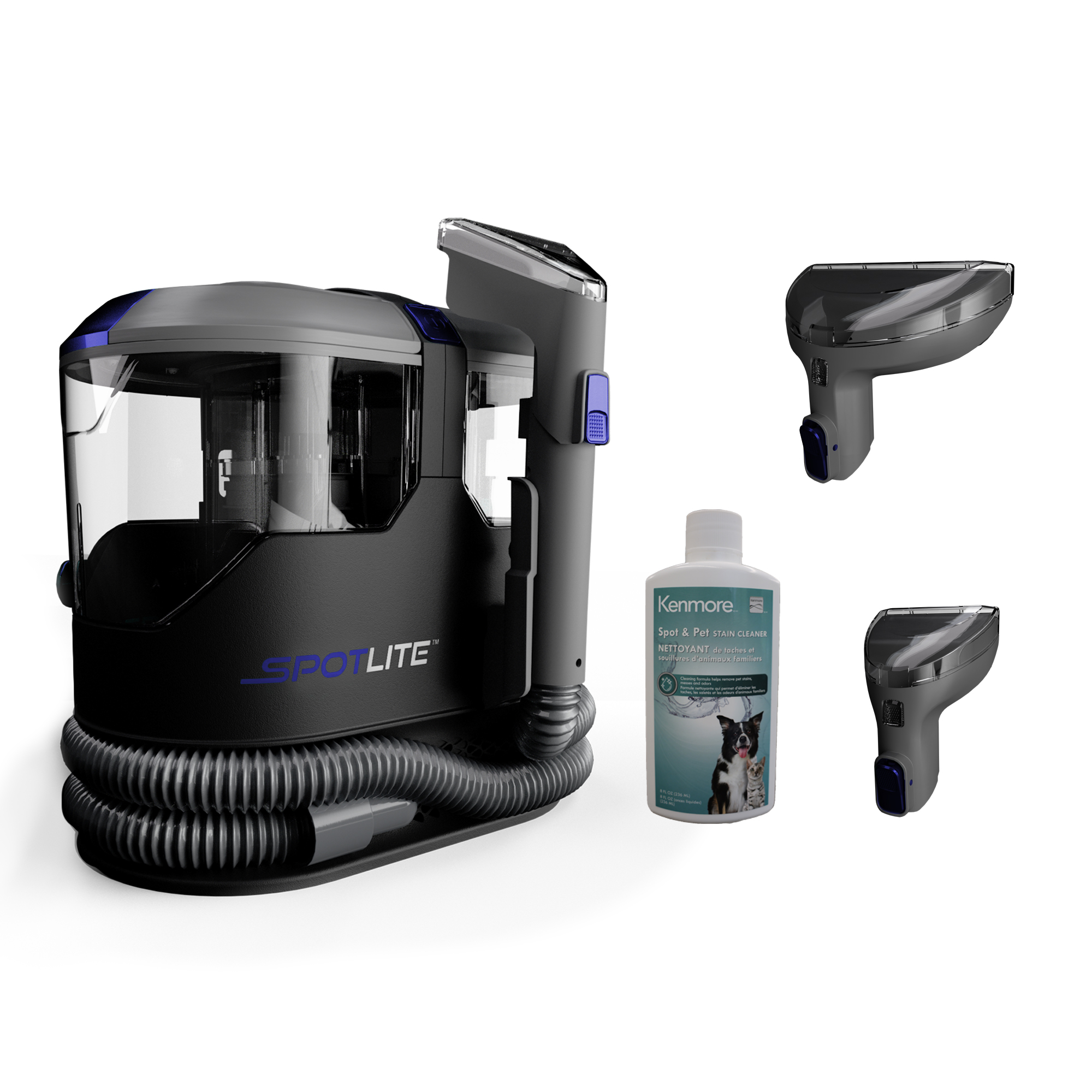 The Kenmore Spot & Pet Stain Cleaner is designed for unexpected spills and messes around the house. Stains are easily lifted and removed with a combination of powerful scrubbing suction and the Kenmore cleaning formula. Thanks to its lightweight 11 lbs size, this portable spot cleaner is ready to go anywhere and compact enough to fit under the sink or in a closet. Versatile accessories include a tough stain tool, a wide path tool and a trial size of cleaning formula.