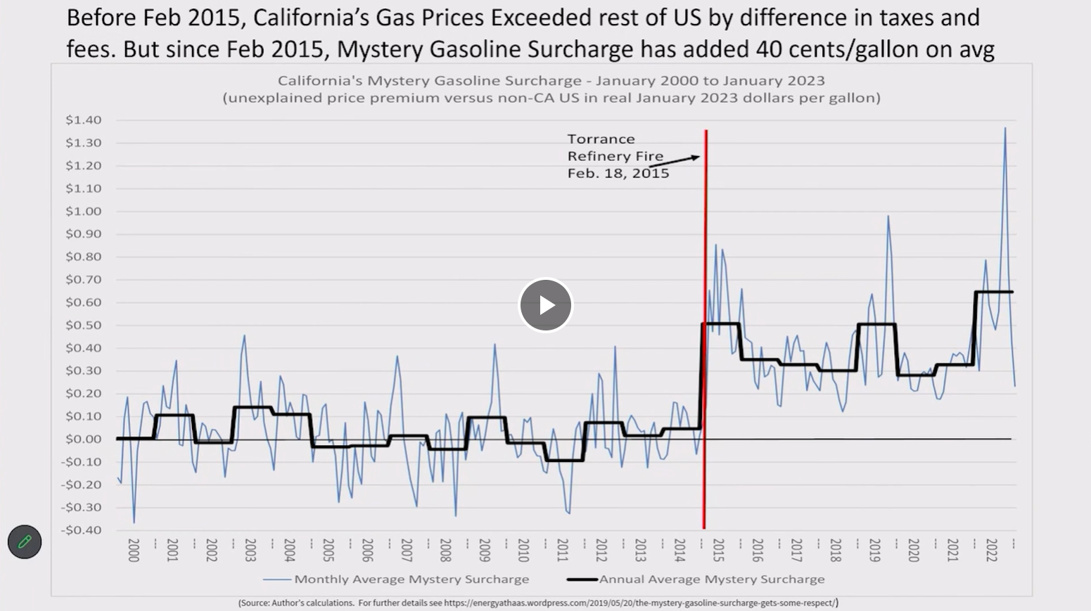 Severin Borenstein, UC Berkeley economist: “Prior to 2015, … California’s price was higher than the rest of the country’s by almost exactly on average the higher taxes and fees. After February of 2015, that hasn’t been the case. And 2022 of course was a huge outlier. … The mystery gasoline surcharge in 2022 was well over $8 billion that Californians paid in excess of what they would’ve paid if California prices were in line with the rest of the country.”