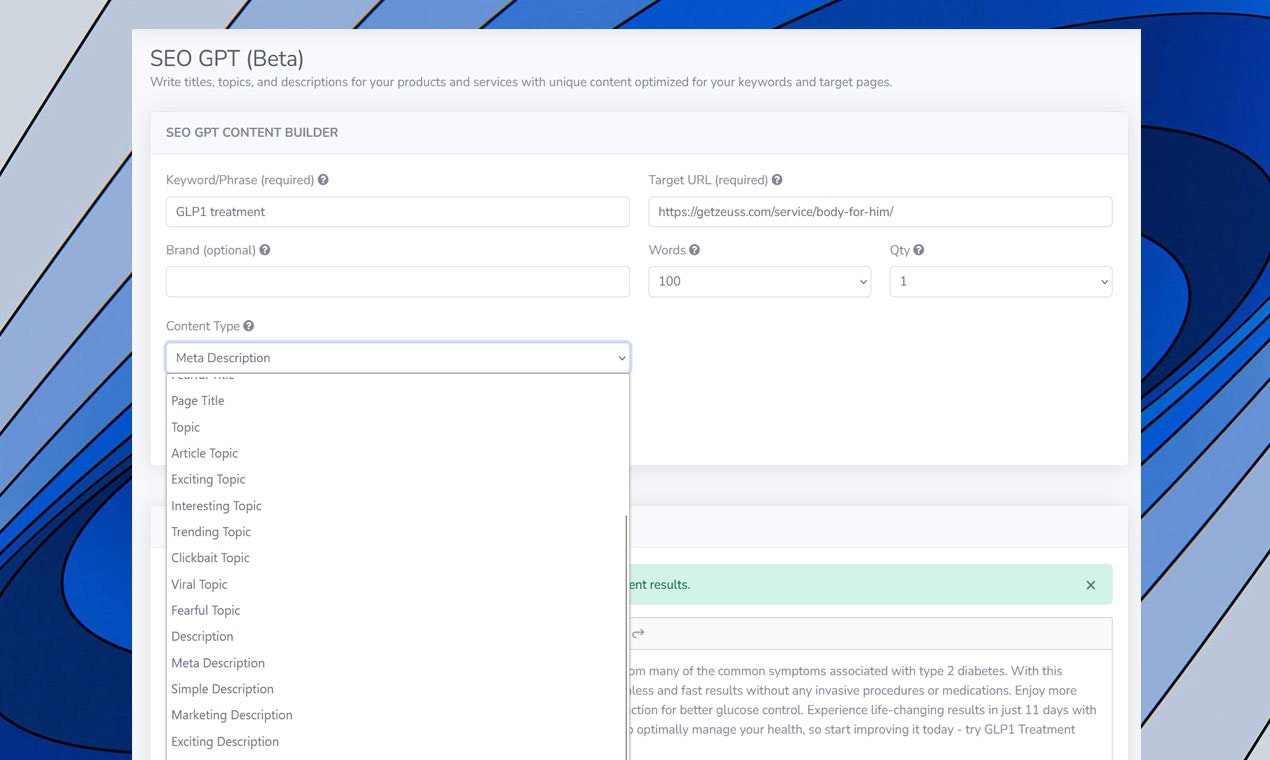 It's a significant leap toward streamlining the content creation process. SEO GPT uses advanced algorithms to automatically scan webpages and produce optimized titles, topics, and descriptions tailored to a specific target audience. This ensures that each page is tailored to the right people, leading to higher conversion rates and search engine rankings.