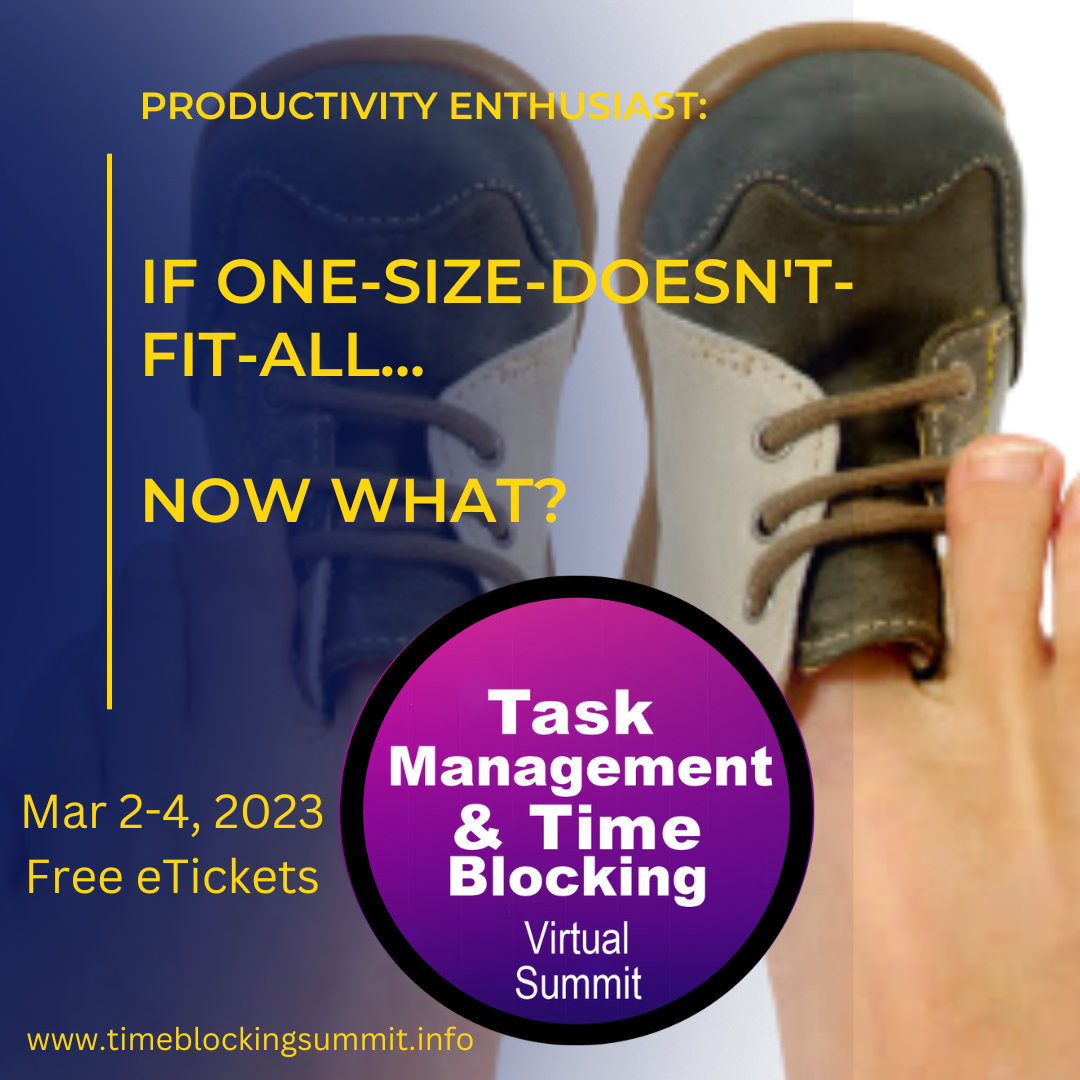 “That’s why we’re having a conference,” explains Francis Wade, convener of the Task Management & Time Blocking Virtual Summit taking place on March 2-4, 2023. This is the fourth annual event, but the theme stands out: “If One-Size-Does-Not-Fit-All...Now What?”
