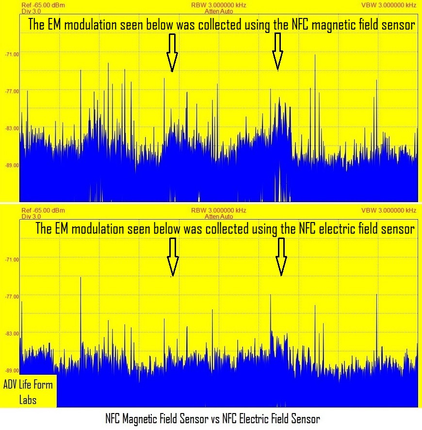 EM spectrum analyzers, coupled to NFC magnetic field and NFC electric field sensors, were positioned near Advanced Life Form contactees to measure the EM modulation power levels and frequencies being emitted. The study was completed in a testing room isolated from wireless network interference and background sources of electromagnetic energy. Three independent trials with each NFC sensor were conducted to verify the EM modulation power levels and frequencies being collected. The investigation helps to show the benefit of adding an NFC magnetic field sensor to the gamut of instrumentation currently used to study Advanced Life Form contactees.
