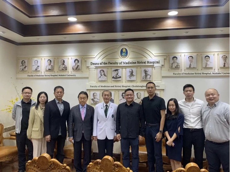 ศ.นพ.อภิชาติ อัศวมงคลกุล คณบดี คณะแพทยศาสตร์ศิริราชพยาบาล มหาวิทยาลัยมหิดล (คนที่ห้าจากทางซ้าย) เข้าพบ ดร. หยิน เย่ และทีมของเขา