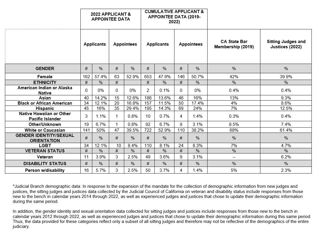 SACRAMENTO – Governor Gavin Newsom today released judicial applicant and appointee data for the administration’s judicial appointments.