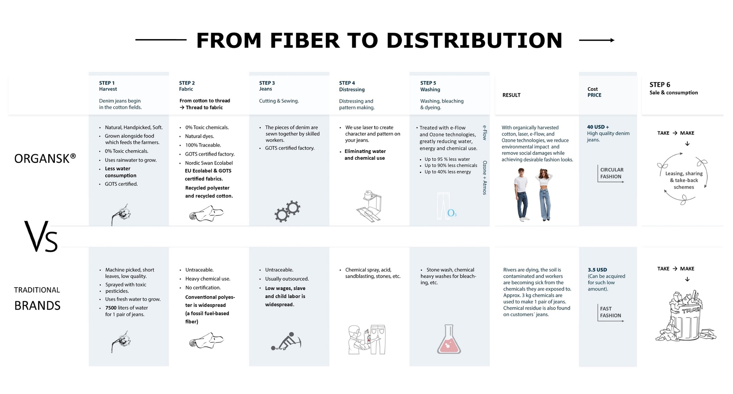 On organsk.com, customers can easily buy, lease or rent jeans. A monthly subscription plan allows customers to swap jeans with a few clicks at no additional cost, while offering full transparency of where, how and by whom the product is made. By circulating garments in addition to providing hard data and ecolabelling across the entire product range, ORGANSK® wants to make it easy for the conscious consumer to make the right choices.