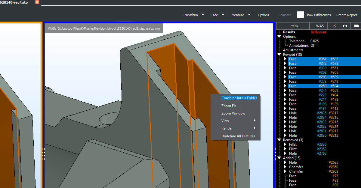 Revision report-building has been enhanced with a new annotation function to attach precise angle measurements to sets of points or linear edges on the 3D model. Custom organization of the differences the software finds between revisions of a CAD model has been improved: the user can now select sets of faces of a model in the graphics window to be combined into a single difference for the report.
