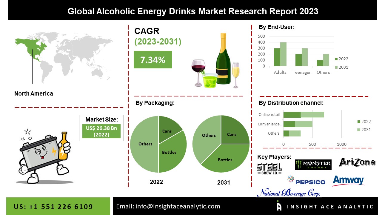 NEW JERSEY, SATTE NJ, USA, March 3, 2023 /EINPresswire.com/ -- InsightAce Analytic Pvt. Ltd. announces the release of a market assessment report on the "Global Alcoholic Energy Drinks Market Size, Share & Trends Analysis Report By Packaging (Cans And Bottles), End Users (Adults And Teenagers), And Distributional Channel (Supermarkets And Hypermarkets, Convenience Stores, Online Retail And Others)- Market Outlook And Industry Analysis 2031"