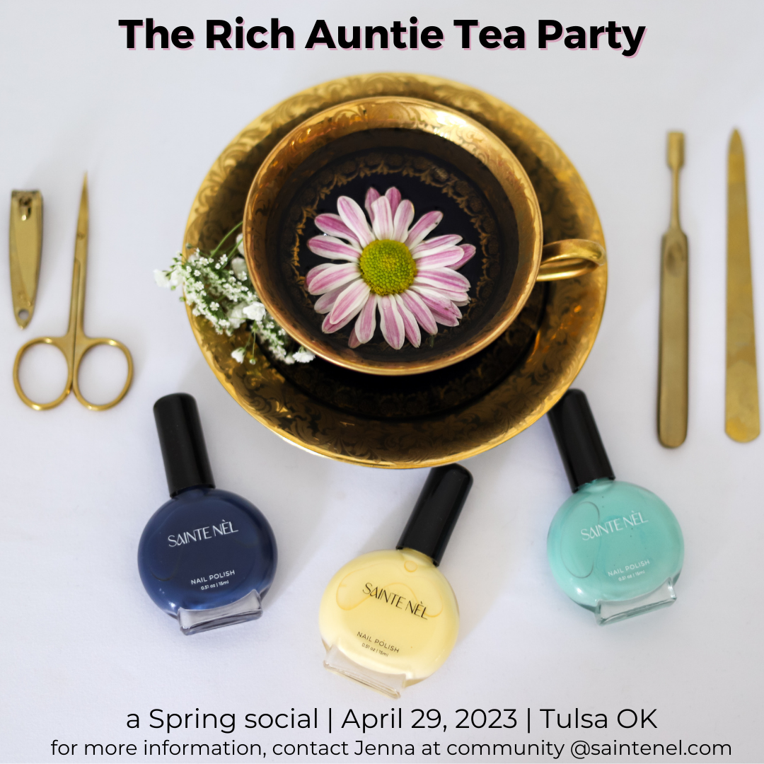 TULSA, OK, UNITED STATES, March 3, 2023 /EINPresswire.com/ -- Sainte Nèl, a Tulsa based non toxic nail care and wellness company, is hosting the Rich Auntie Tea Party to celebrate Spring and fundraise for its 2023 philanthropic efforts. The event, hosted at a private residence, will be held on Saturday, April 29, 2023 at 2:00pm and will feature a tea tasting of women owned tea brands. Each ticketed guest will take home a china tea cup and saucer set, custom made for the event.