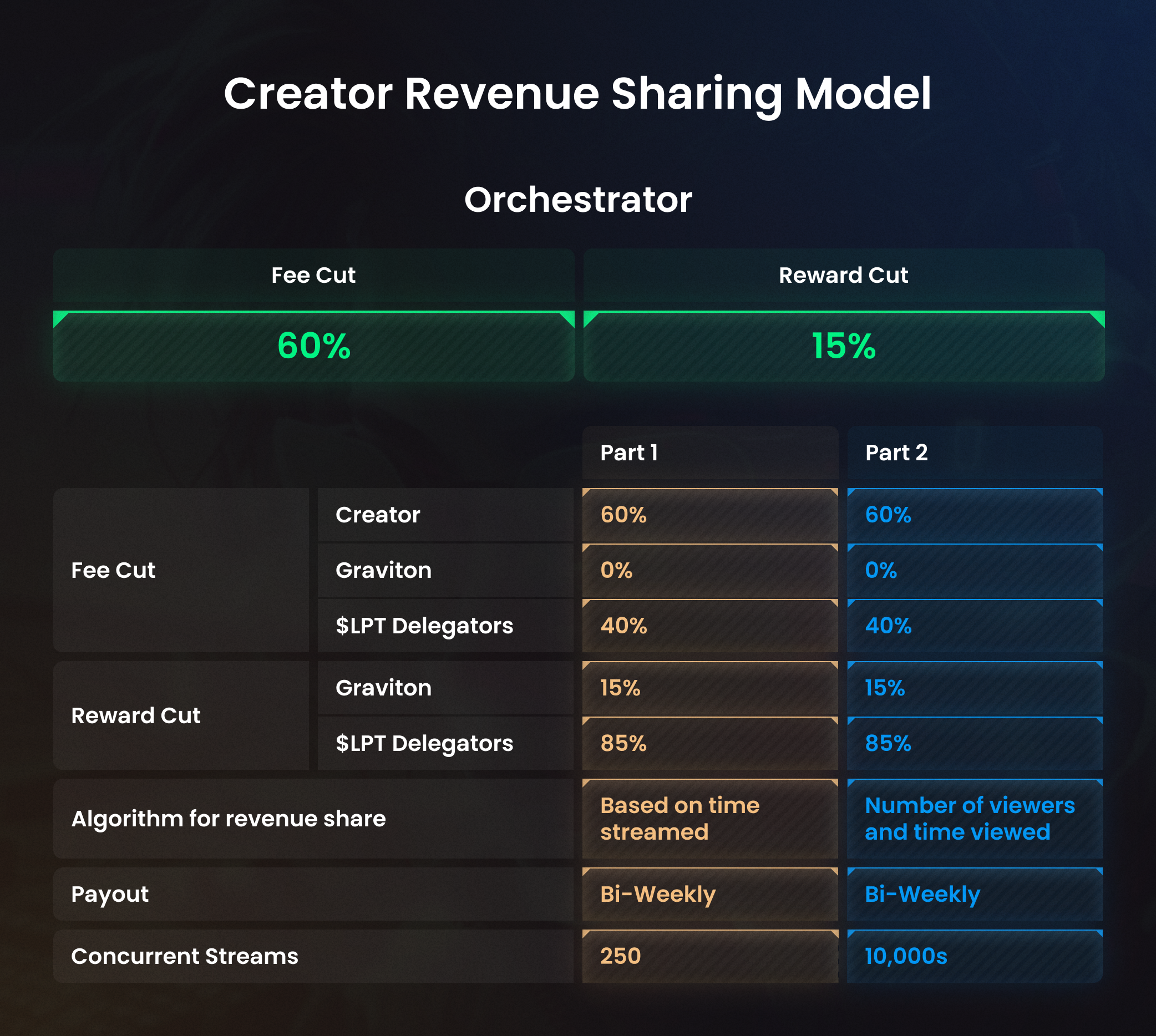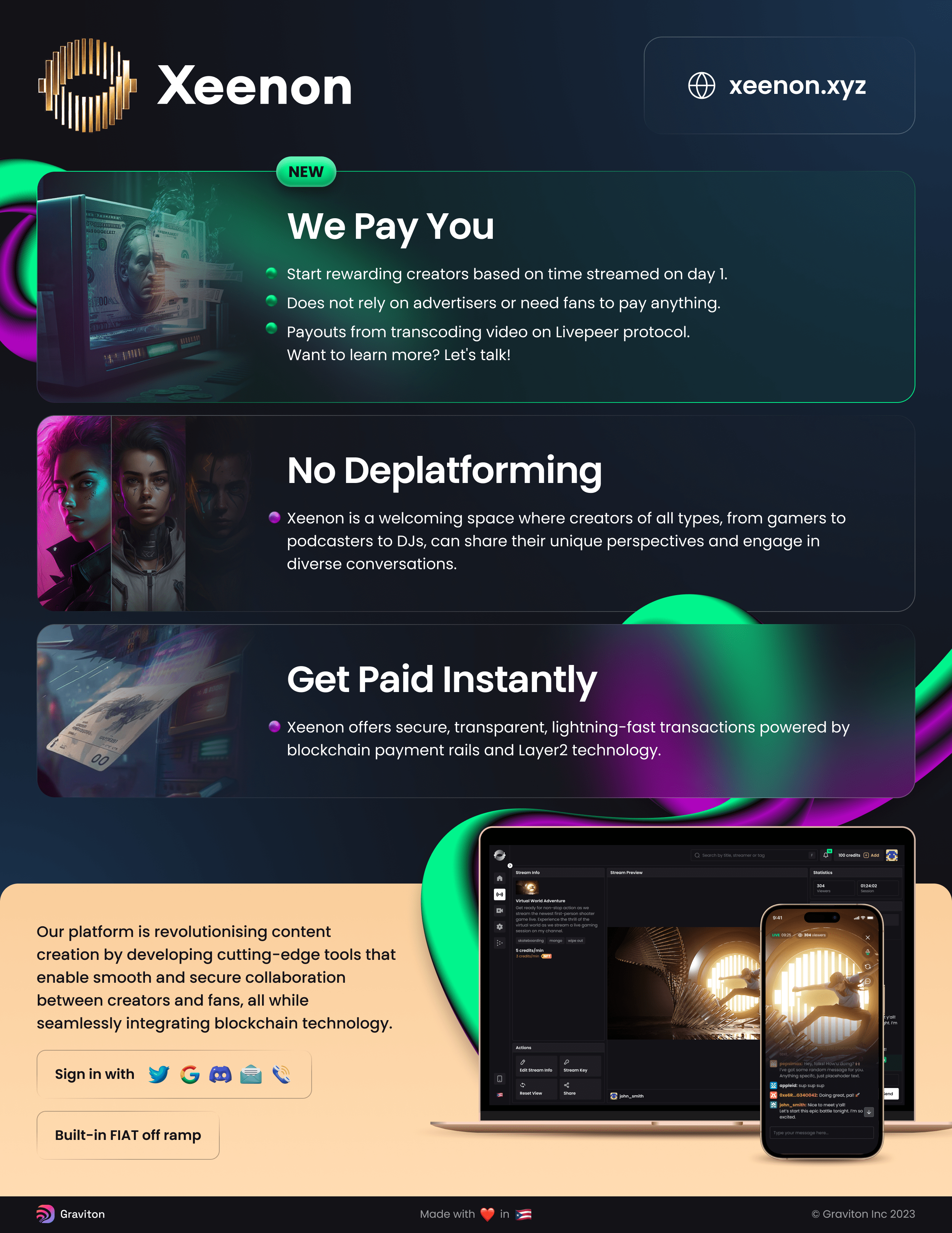 With the launch of Phase 2 of the rollout, Xeenon introduces the Creator Revenue Sharing Model that increases the fee cut to 60% and the reward cut to 15% on the Orchestrator. Graviton is sending 100% of the 60% back to the Content Creators which is generated using blockchain infrastructure. It's time to start earning for the content that you create, right from the start.