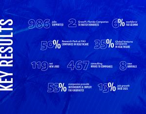 BOCA RATON, FL, UNITED STATES, March 8, 2023 /EINPresswire.com/ -- One hundred nineteen (119) net new jobs were created by companies located in the Research Park at Florida Atlantic University® in 2022, meaning nine hundred eighty-six (986) overall jobs were supported in the Park, an increase of twelve percent (12%) over the previous year.Employers in the commercialization and innovation center with campuses in Boca Raton and Deerfield Beach range from the aerospace to the healthcare industries, all working with Florida Atlantic University’s (“FAU”) faculty and student body in various ways; more than half of the companies employ FAU interns and alumni.