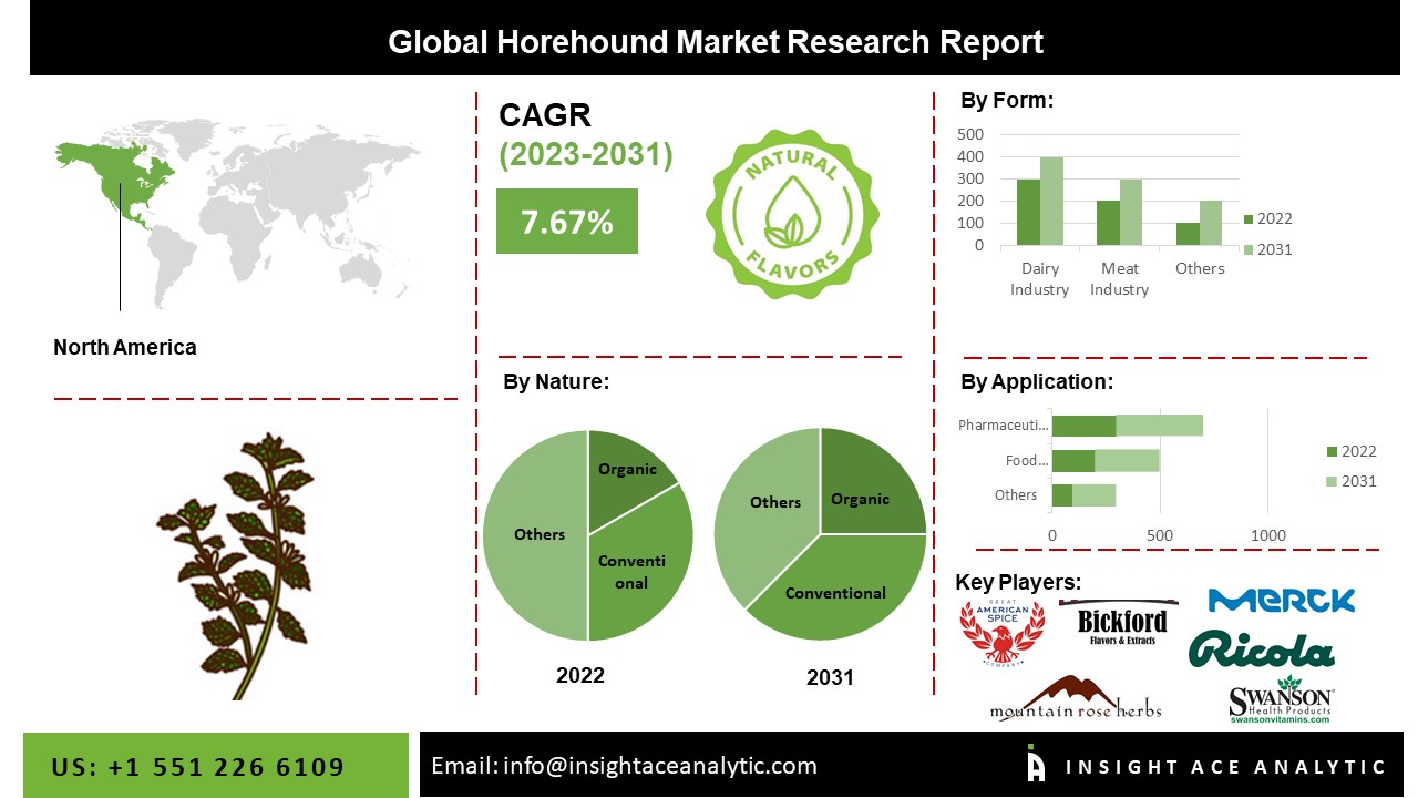 NEW JERSEY, SATTE NJ, USA, March 9, 2023 /EINPresswire.com/ -- InsightAce Analytic Pvt. Ltd. announces the release of a market assessment report on the "Global Horehound Market Size, Share & Trends Analysis Report by Nature (Organic And Conventional), Form (Liquid, Powder And Oil) And Application (Food Flavoring Agent And Pharmaceuticals & Drugs)- Market Outlook And Industry Analysis 2031"