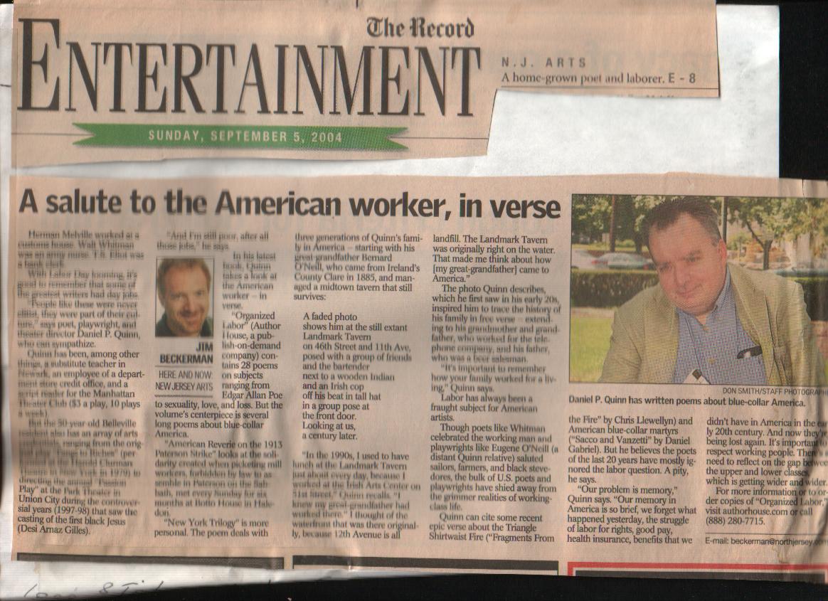 "Organized Labor by Daniel P. Quinn is a wonderful book of poems. His language is very specific and his images powerful. There are poems that evoke old New York and also poems that address recent issues we face today in the world since 9/11". Review by Davidson Garrett