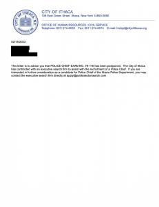 On February 15th applicants unexpectedly received an unsigned letter from the City of Ithaca Department of Human Resources indicating that the exam is being “postponed” with no mention of an alternative test date.