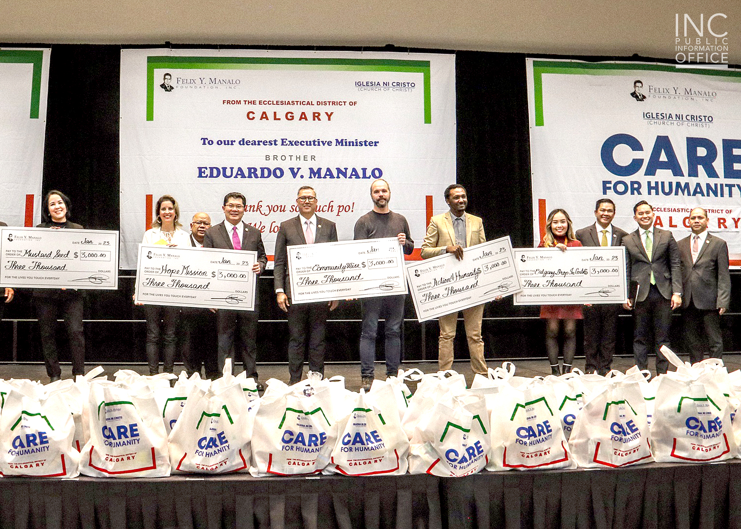 A total of $21,000 CAD was distributed by the Felix Y. Manalo Foundation to assist the efforts of various charities in Canada. Among the charity organizations that received the cash donations were the following: Hope Mission, Calgary Drop-In, Action4Humanity, Community Wise, and Mustard Seed which are all based in Calgary and received $3,000 each; University of Alberta Philippine Students’ Association, The Mustard Seed Edmonton, Stollery Children’s Hospital, and Edmonton Food Bank, which are based in Edmonton and received $1,000 each; and Chez Doris and Advocacy for Montreal which are both based in Montreal and received $1,000 each.