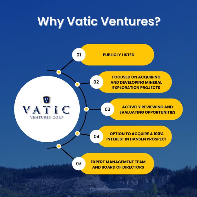 Vatic Ventures Corp. (OTCQB: VCVVF, TSXV: VCV, FRA: V8V) is a mineral exploration company strategically positioned with an option to acquire and develop a 100% interest in a 243 km2 Rare Earth Elements (REE) and polymetallic project known as the Sisters Mountain critical metals project in New Brunswick, Canada. This property is believed to potentially host REE, tin, tungsten, molybdenum, Platinum Group Metals (PGE), and base metals, and Vatic has the option to acquire a 100% interest in the Hansen gold project, located in an emerging gold exploration area with over 6.7 million ounces of gold produced, in Quebec, Canada.