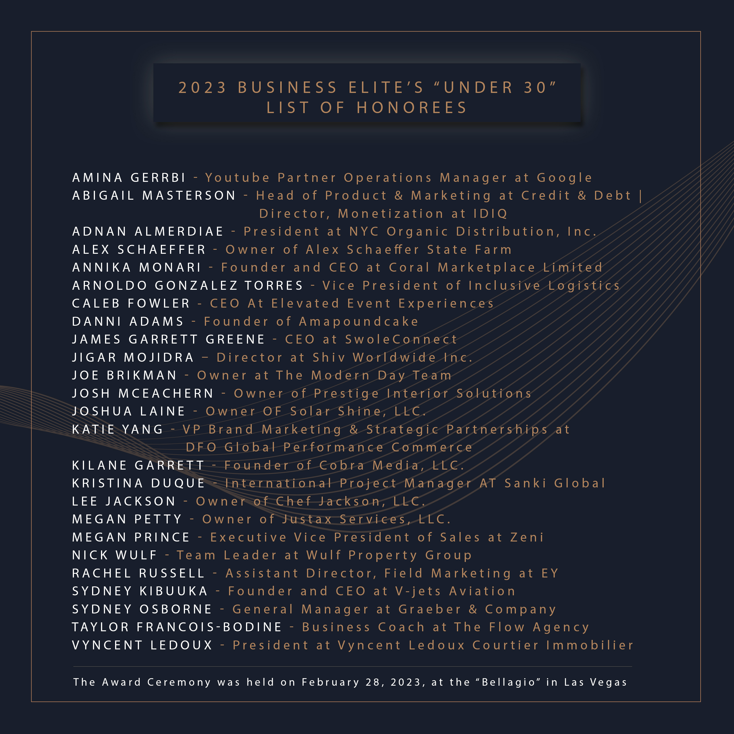 "The 'Under 30' honorees are the future of business, and we are thrilled to give them recognition for their exceptional business talent, innovative ideas, remarkable achievements and entrepreneurial spirit at this year's gala dinner," said Viktor Gjorgjieski, Ph.D., Director of Business Elite Awards. "These young leaders are already making significant contributions to their respective industries and communities and paving the way for a brighter future."