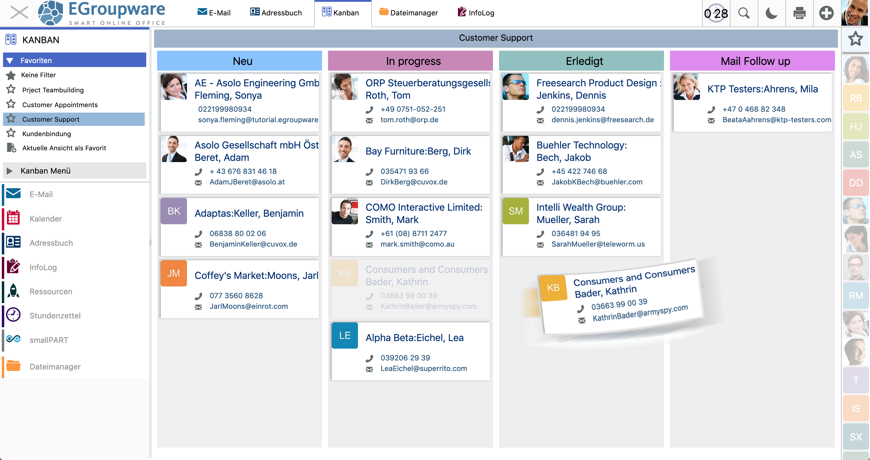 The mobile view now supports drag & drop, which simplifies working with the Kanban board on a tablet, for example. In the import dialogs, users can now define a different owner. All modules can activate a Kanban column—so it is obvious to which Kanban board a ticket, project, contact, or task belongs.