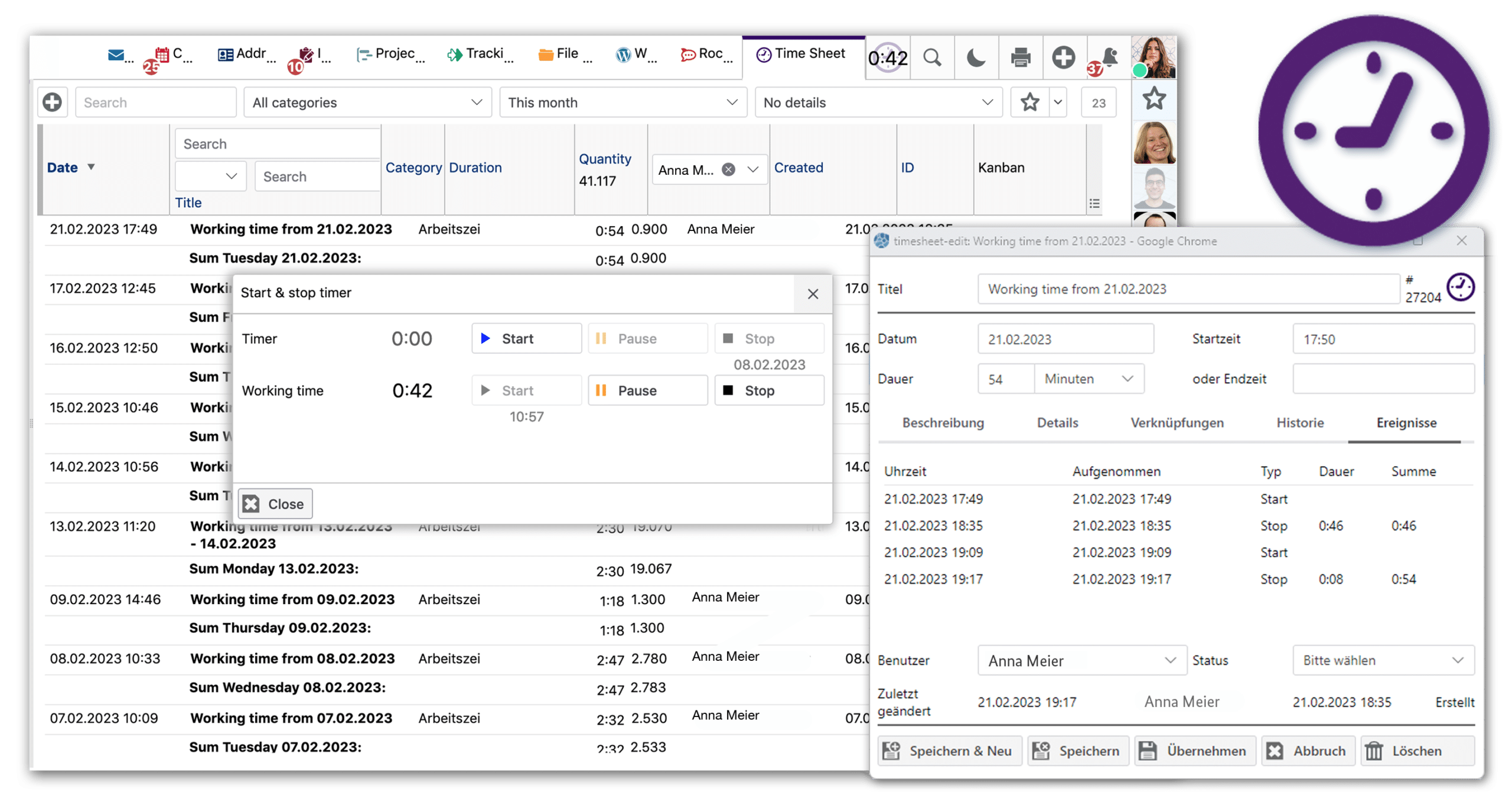 The groupware solution will prompt the user if the time recording runs for an unusually long time. Both timers also support the subsequent editing of entries. EGroupware marks such records as modified.