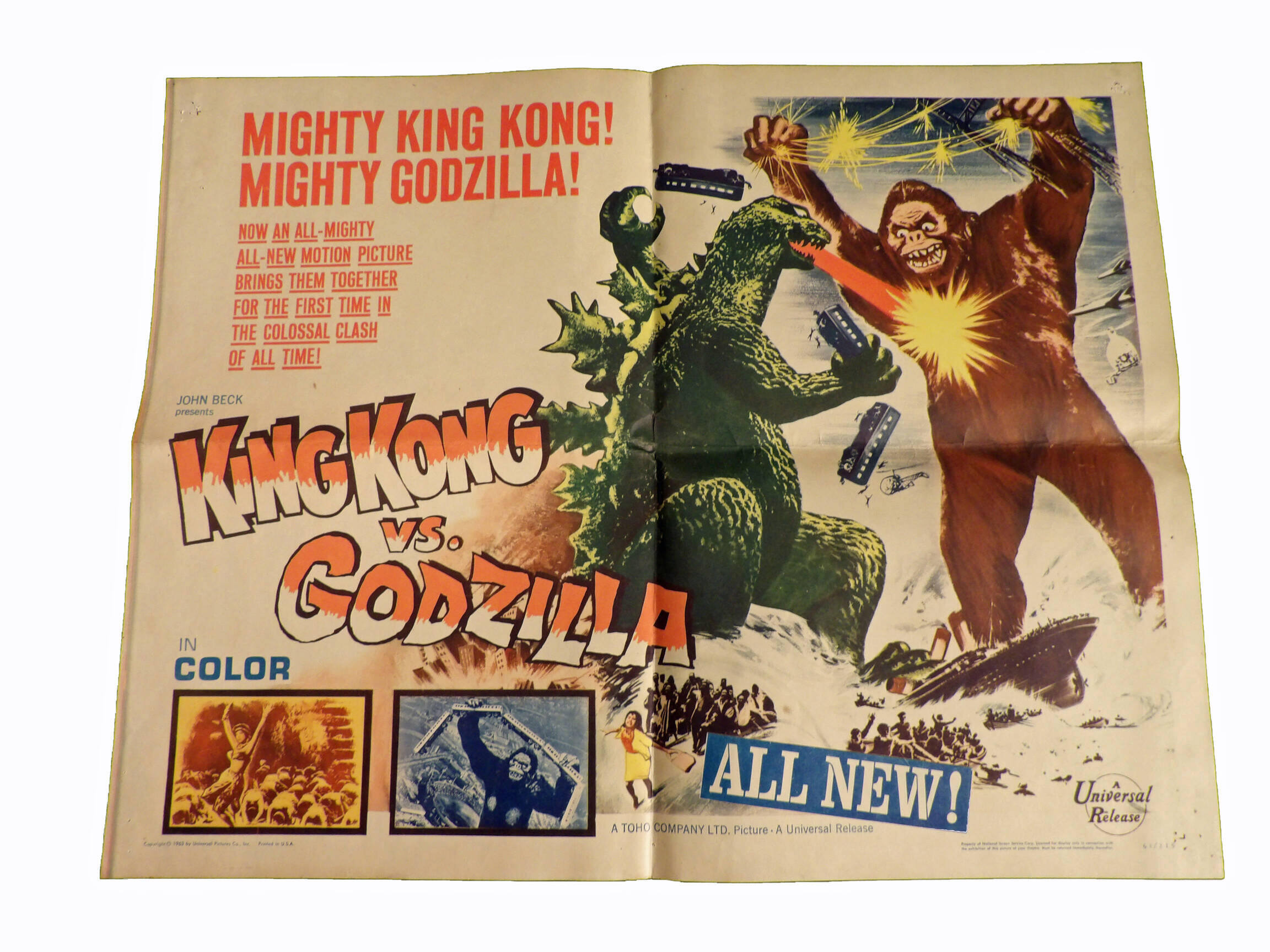 Half-sheet poster for King Kong vs. Godzilla (Universal, 1963), depicting the two monsters engaged in battle, measures 22 inches by 28 inches.