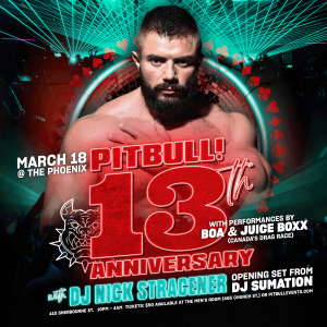 TORONTO, ONTARIO, CANADA, March 16, 2023 /EINPresswire.com/ -- Founded in Toronto, Canada in 2010, Pitbull Events is a grassroots 2SLGBTQ+ entertainment company. Catering to the gay community who are looking for inclusive event’s fun events and without pretensions. The company began as an event conceptualized by Francis Gaudreault and Steve Palmer on the second floor of the now defunct Fusion Reso-Lounge, (currently the Storm Crow Manner), and has now become a staple of the 2SLGBTQ+ nightlife in Toronto. It celebrates its 13th anniversary in promises to be an epic night of dancing with DJ Nick Stracener from Dallas Texas, on Saturday, March 18th, 2023, from 10pm to 4am at the Phoenix Theater at 410 Sherbourne Street, Toronto.“At the time, we perceived an opportunity to create a dancefloor that didn’t specifically cater to the circuit crowd of the day,” said Francis Gaudreault, co-founder and owner, “The first event was designed to offer a different musical style than was currently the norm, one that catered to the non-circuit crowd and was more inclusive. It grew fairly quickly over following two years and we’ve been able to innovate so that it stays current and welcoming to anyone who was looking to dance.”