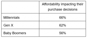 GfK also found that money worries are having a big impact on near-term Millennial auto intenders – with two-thirds (66%) reporting that affordability is impacting their car purchase decision. (See Table 1. ) Almost four in 10 (37%) affected near-term Millennials say they would cut expenses in other areas to afford a new vehicle, while 31% said they would switch to a lower-cost model, and 29% plan to look for longer-term financing.