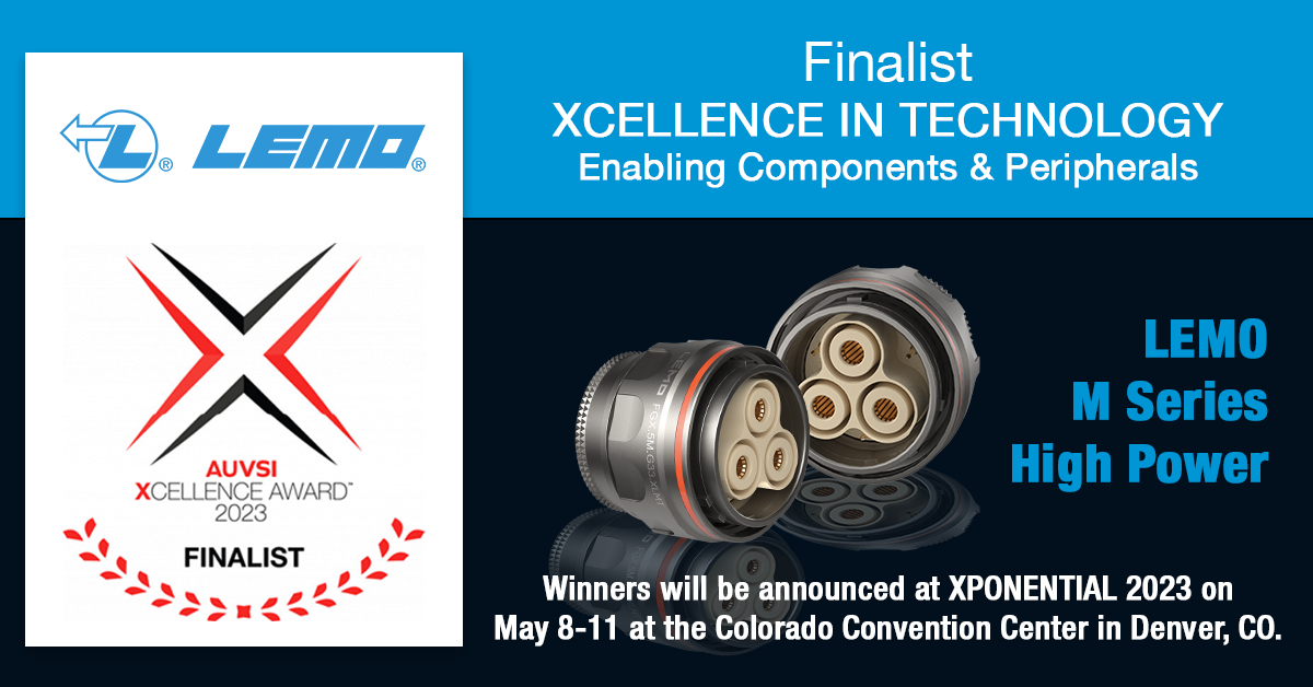 ARLINGTON, VIRGINIA, UNITED STATES, March 16, 2023 /EINPresswire.com/ -- LEMO Corporation has been named as a finalist in the TECHNOLOGY CATEGORY of the XCELLENCE Awards by the Association for Uncrewed Vehicles Systems International (AUVSI). LEMO M Series High Power was selected from a pool of accomplished applicants as one of several finalists. Winners will be announced at AUVSI XPONENTIAL 2023 on May 8-11 at the Colorado Convention Center in Denver, CO.“This year, XPONENTIAL is all about designing a shared plan for the future of autonomy,” said Brian Wynne, President and CEO of AUVSI. “There’s no better place to announce the 2023 XCELLENCE award finalists. Together, they’re redefining what’s possible with uncrewed and robotic technology.”