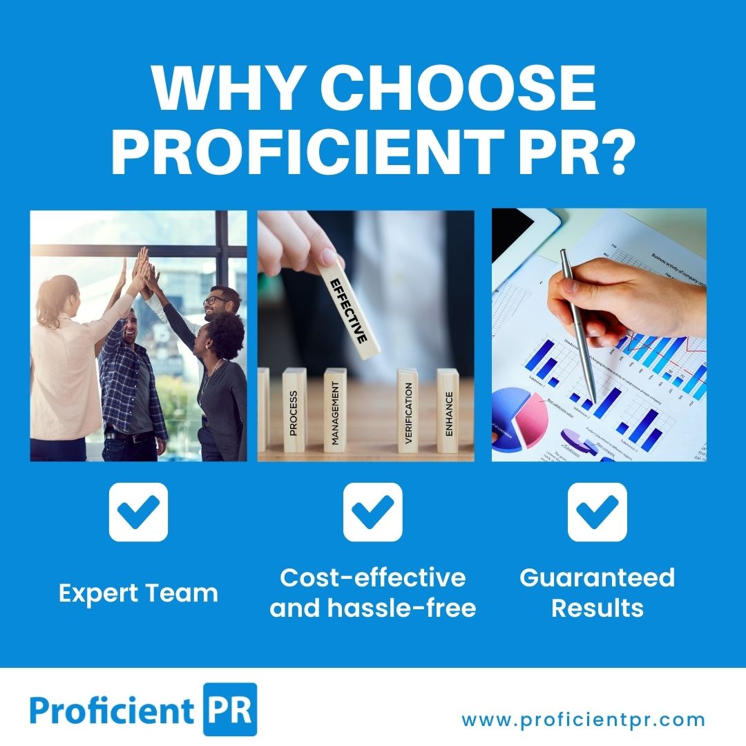 Proficient PR's top-quality customer service and innovative solutions have helped clients achieve their marketing goals while saving time, resources, and money. Whether businesses are looking to announce a new product or service, expand their customer base, or establish themselves as thought leaders in their industry, Proficient PR's services can help them achieve their goals.