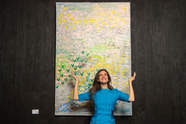 Set within a historic, exquisitely re-imagined six-story department store, Aida’s exhibit of nine paintings, called “Being In Joy,” tells a story about the nine pillars of joy. Each painting represents a pillar. Collectively, the exhibit communicates Aida’s formula for building the “joy muscle.”