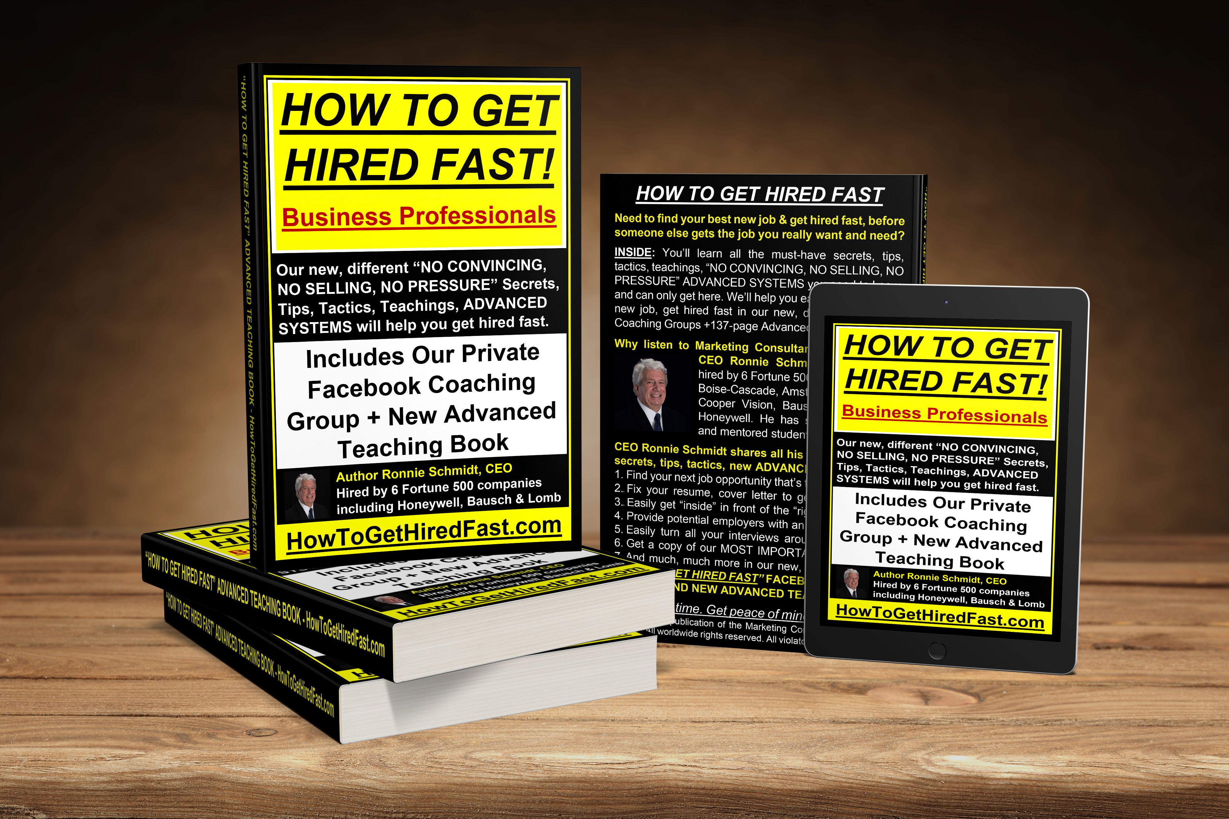 Author Ronnie Schmidt, Marketing Consultants Group LLC’s CEO was hired by 6 Fortune companies including Honeywell and Bausch & Lomb in multiple industries and is sharing all of his and other’s secrets, tips, tactics, teachings, and "No Convincing, No Selling, No Pressure" Advanced Systems in his new, different HOW TO GET HIRED FAST Private Facebook Coaching Group and New Advanced Teaching Books because he did not get the mentoring he needed during the time he went to and graduated from Penn State University.