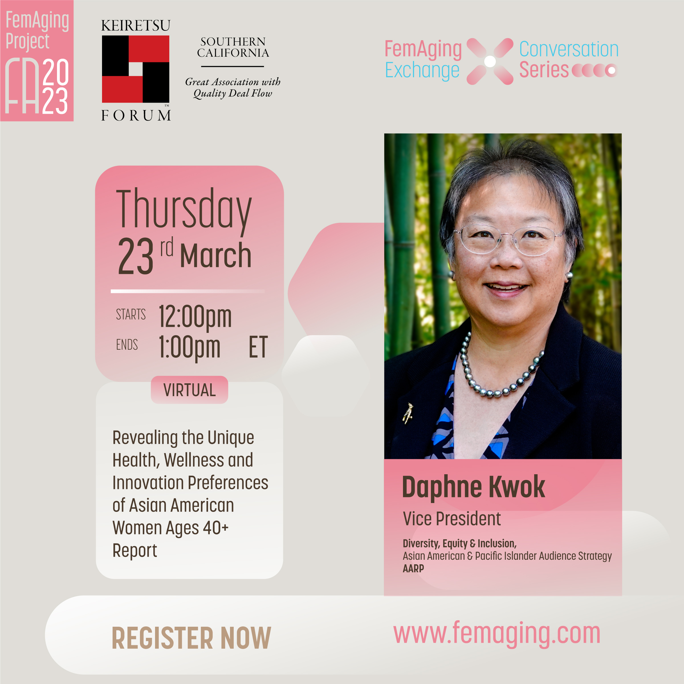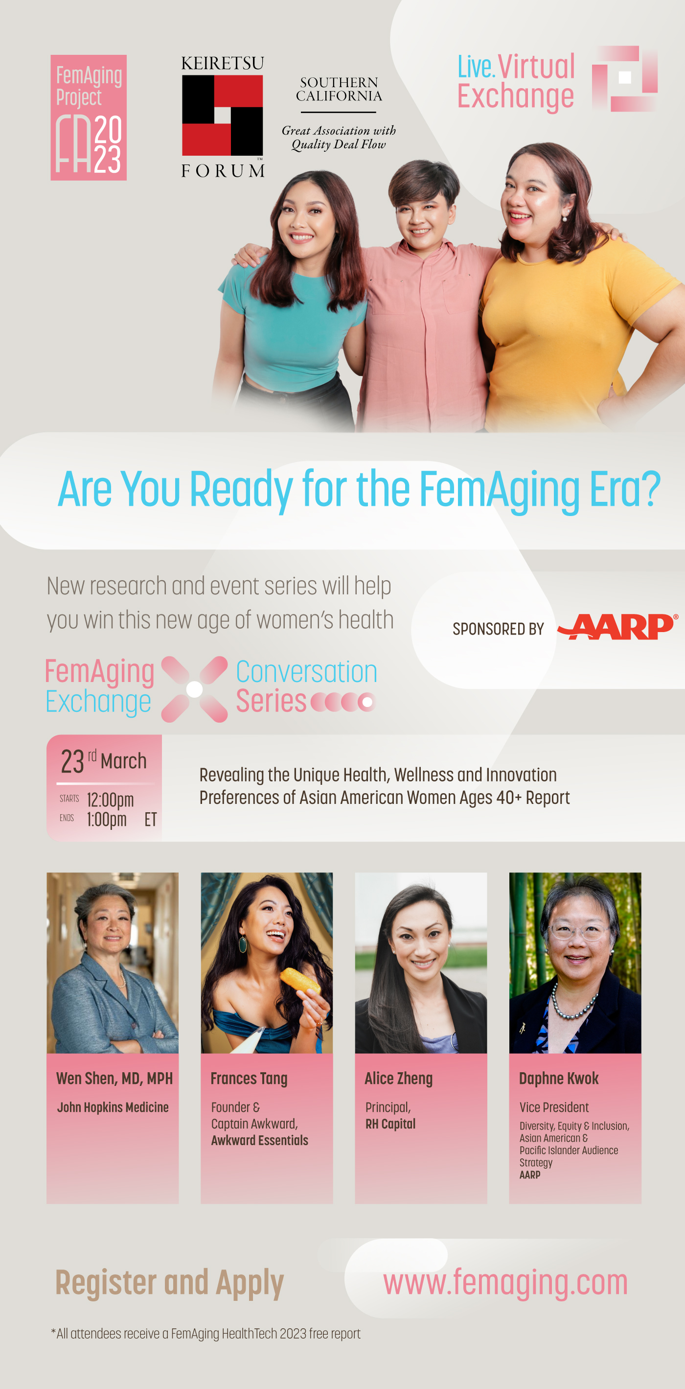 Please visit www.femaging.com to register for the free virtual event or to download the 2023 report. On April 13, the Project will hold the Fast Pitch Competition, in partnership with Keiretsu Forum SoCal, which will feature FemAging innovators competing for cash and in-kind services. To learn more, visit www.femaging.com/femagingera.