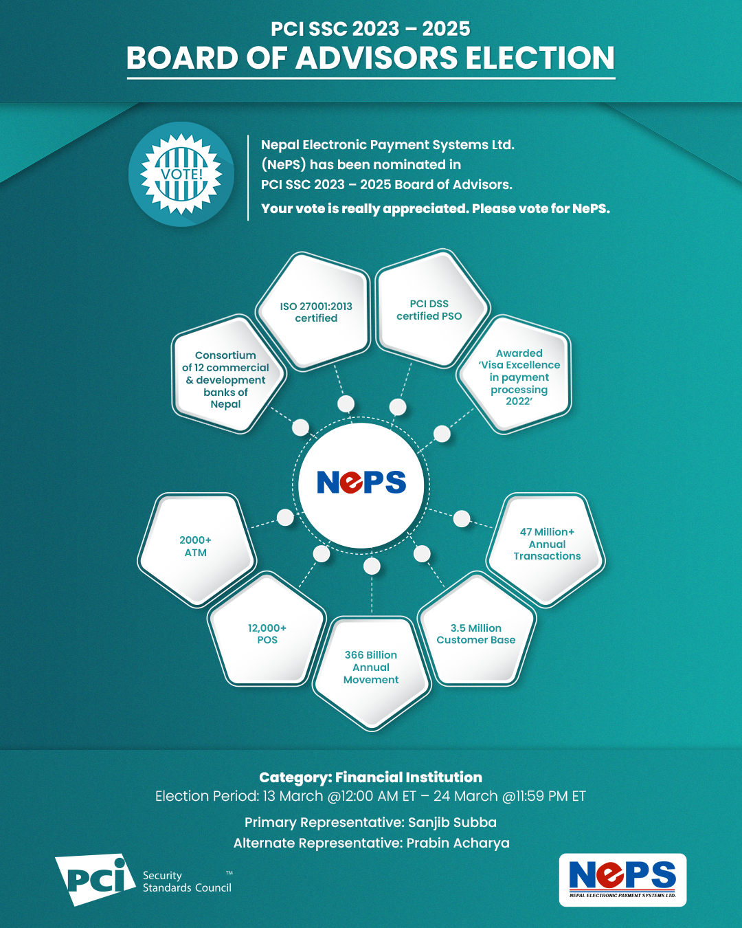 KATHMANDU, BAGMATI, NEPAL, March 22, 2023 /EINPresswire.com/ -- Nepal Electronic Payment Systems Ltd (NePS), a licensed Payment System Operator and a consortium of leading national and development banks of Nepal, announced today that it has joined the PCI Security Standards Council (PCI SSC) as a new Associate Participating Organization. NePS will work with the PCI SSC to help secure payment data worldwide through the ongoing development and adoption of the PCI Security Standards.The PCI SSC leads a global, cross-industry effort to increase payment security by providing flexible, industry-driven, and effective data security standards and programs. Global industry collaboration is critical to this mission. The Council's Participating Organizations program brings together industry leaders to strategize about how to protect payment data from the latest threats and to anticipate the needs of an ever-changing payment ecosystem.