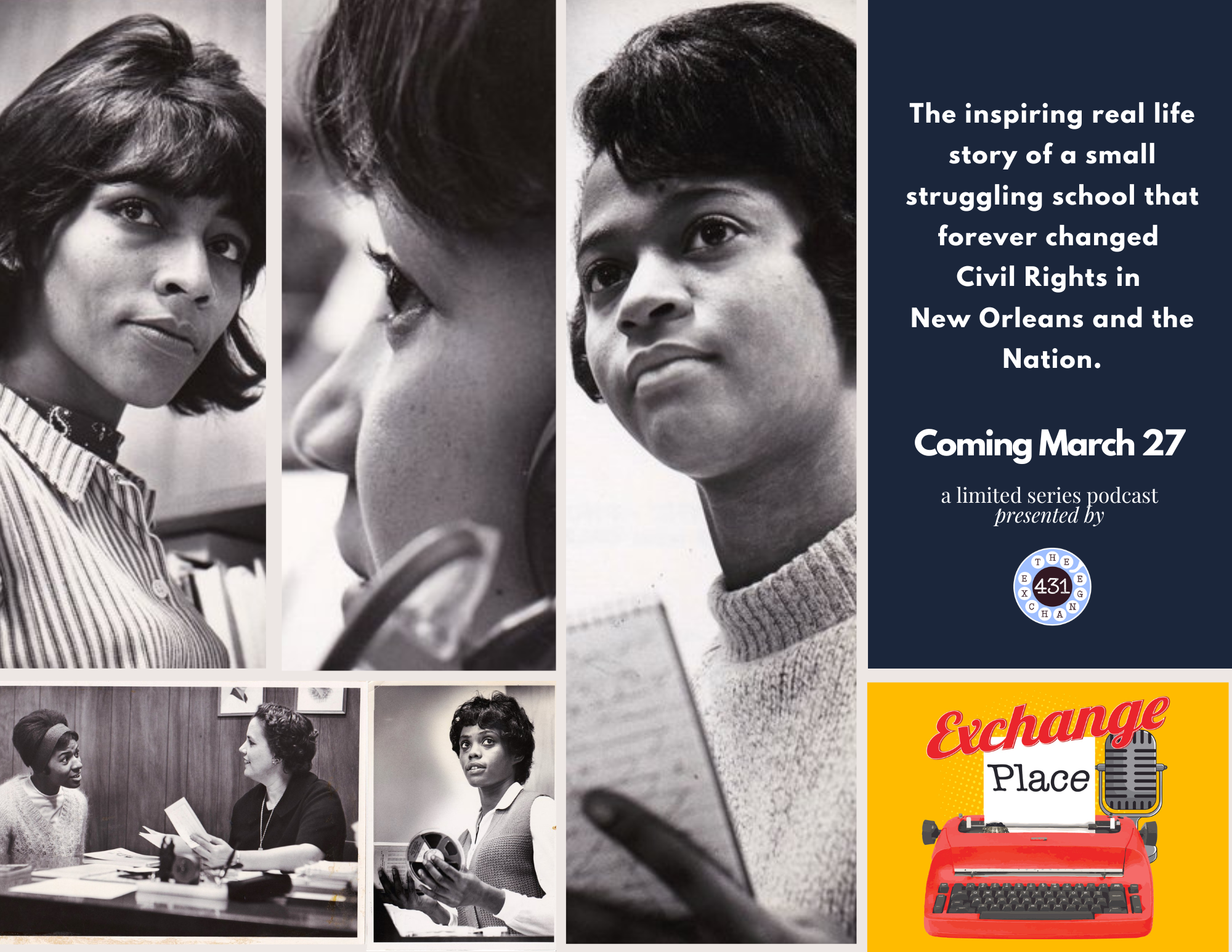 NEW ORLEANS, LA, USA, March 23, 2023/EINPresswire.com/ -- EXCHANGE PLACE Podcast, a limited audio storytelling series, will launch Season One on Monday, March 27, 2023 to all major podcast streaming platforms. Set against the backdrop of a newly desegregated Deep South, four African-American graduates of a small adult education school, called “The Adult Education Center,” in New Orleans tell their incredible stories of perseverance and triumph as they became the first to integrate into major US corporations like Texaco, IBM, and Shell Oil.