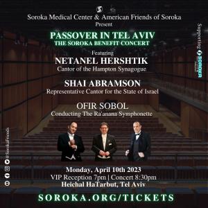 TEL AVIV, ISRAEL, March 22, 2023 /EINPresswire.com/ -- Soroka Medical Center is hosting an extraordinary musical evening in Tel Aviv this Passover, on Monday April 10th at Heichal HaTarbut, Tel Aviv’s premier music venue. World-renowned cantors Netanel Hershtik and Shai Abramson, conductor Ofir Sobol and the Ra’anana Symphonette will perform. A special VIP reception will be held prior to the concert. The evening benefits Soroka Medical Center, Israel's leading healthcare institution. Located in Be'er Sheva, it is the sole medical center in the entire southern region of Israel, one of the country's most diverse and fastest-growing areas. Soroka serves over 1.2 million people, including over 400,000 children, in a region that comprises 60% of Israel's land.Netanel Hershtik, a fourteenth-generation chazzan, has performed at many of the world’s most prestigious venues, including the Sydney Opera House and the United Nations. He feels deeply connected to Soroka given his service in the IDF as a medic in the Negev. Hershtik states: “Chazzanut is the most authentic expression of the heart via music. Chazzanut at its core was made to express our deepest spiritual yearnings in language that is higher than words: that is, music. Together we will make a positive impact for the people of the Negev with Soroka’s healing mission.”