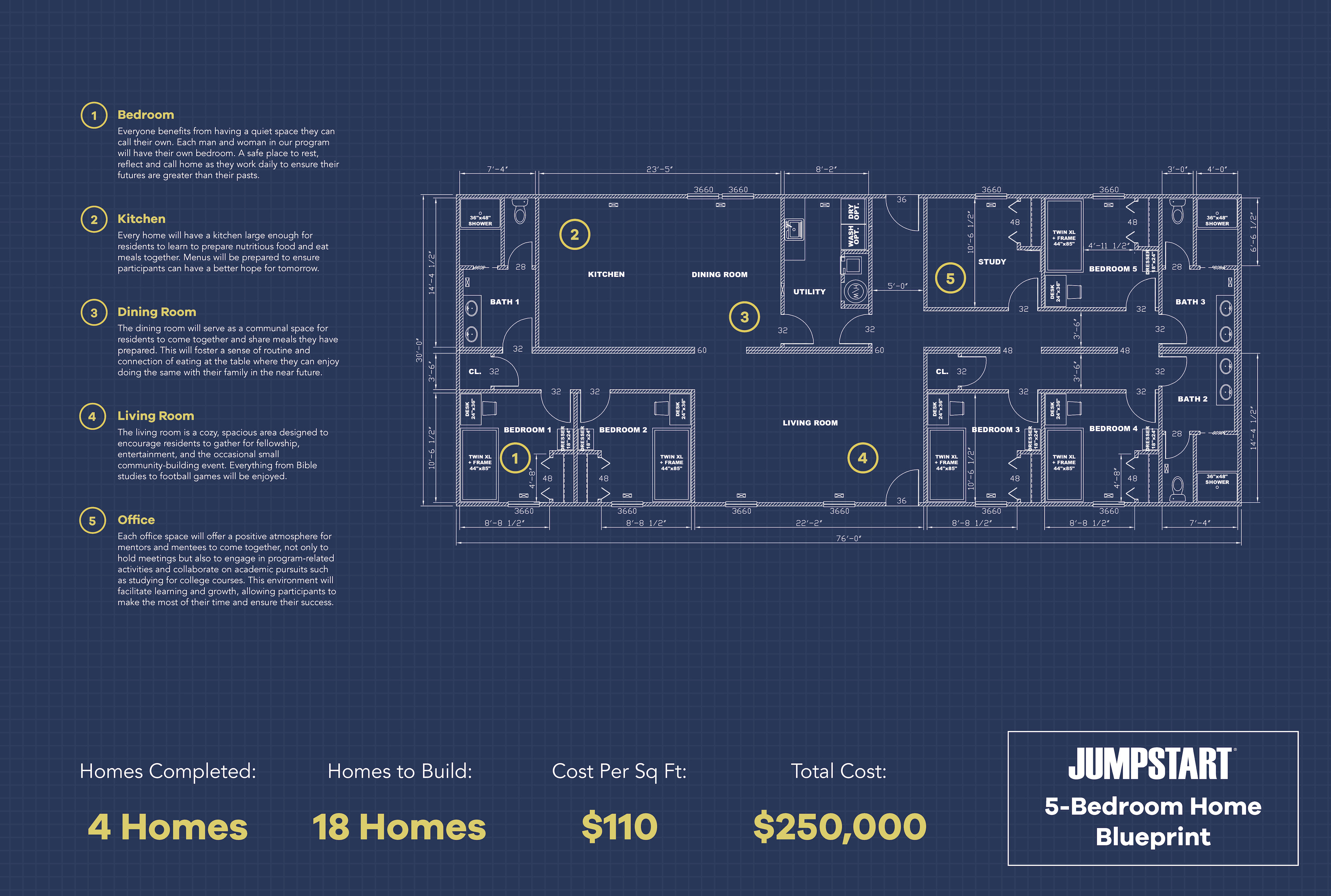 JUMPSTART plans to complete the Opportunity Center, build three additional homes in 2023, and complete the project by 2025. The organization has already raised $4 million to break ground, build the infrastructure for 22 homes, and construct the first four new homes. Now JUMPSTART needs additional donors and partners to join forces to raise capital to complete the project. One five-bedroom home fully furnished in Restoration Village costs $250,000, or $110 per square foot.
