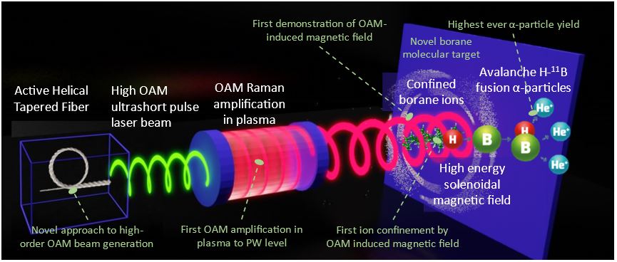 The Vortex-4-Fusion consortium of researchers from Finland, the Czech Republic, Germany and the UK aim to amplify laser pulses with high levels of OAM from a new design of fiber laser by several orders of magnitude via Backscattering Raman Amplification (BRA) enabling the generation of Joule level high-OAM pulses suitable for fusion reactions. The novel approach to generating twisted light aims to realise more powerful laser sources able to generate structured beams, where laser light is generated in the active medium of the fiber laser, with much higher orders of OAM than any existing approach and inducing high axial magnetic fields
