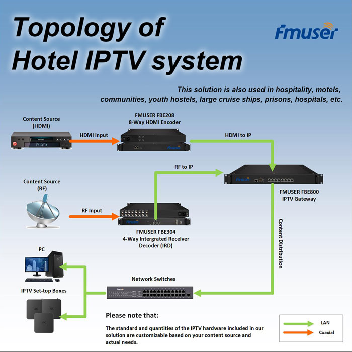 Les solutions hôtelières IPTV de FMUSER sont le meilleur choix pour les hôteliers qui cherchent à passer de la télévision par câble, offrant un contenu personnalisable, une qualité supérieure, une gestion facile et plus d'interactivité. L'IPTV offre également une meilleure expérience de visionnage et permet aux clients d'accéder à du contenu supplémentaire, de jouer à des jeux et plus encore.